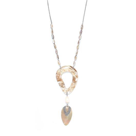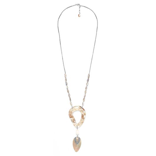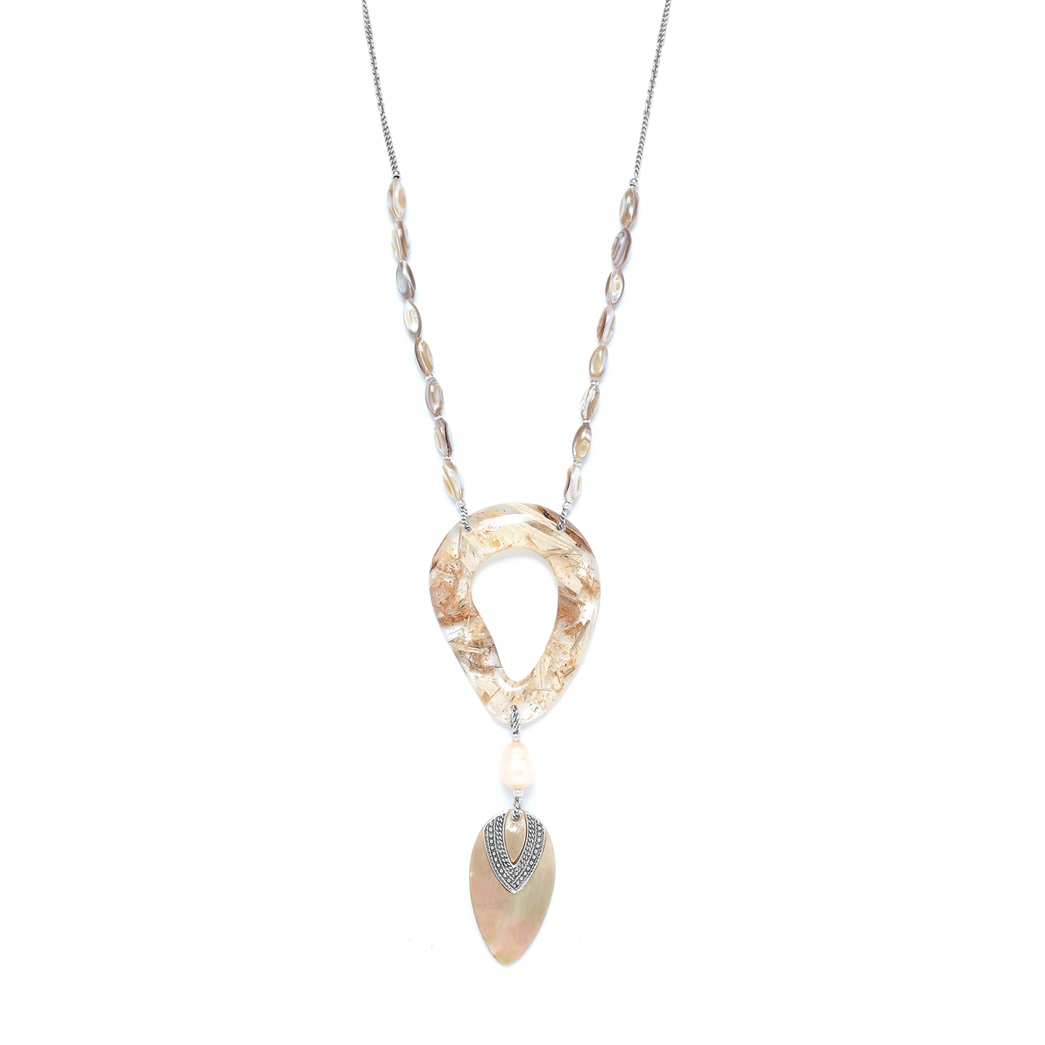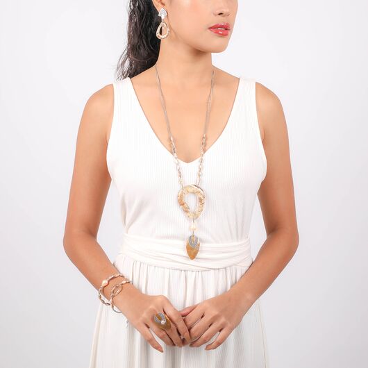 ფრანგული ბრენდი Nature Bijoux ს ხელნაკეთი ყელსაბამი კოლექციიდან ALTAI სამკაულის ბაზად გამოყენებულია თითბერი. კოლექციაში გამოყენებული ნატურალური მასალები და ქვები: ვარდისფერი ნიჟარა, მცენარეული ძაფი, ბანანის ხის ქერქი, ყავისფერი სადაფი, მარგალიტი, წითელი ხე