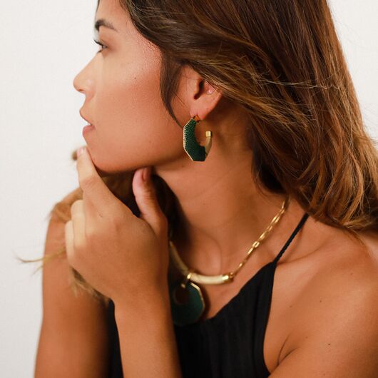ფრანგული ბრენდი Nature Bijoux ს ხელნაკეთი საყურე კოლექციიდან OXFORD. სამკაულის ბაზად გამოყენებულია თითბერი, კოლექციაში გამოყენებული ნატურალური მასალები და ქვები: ტყავი, თამარინდი