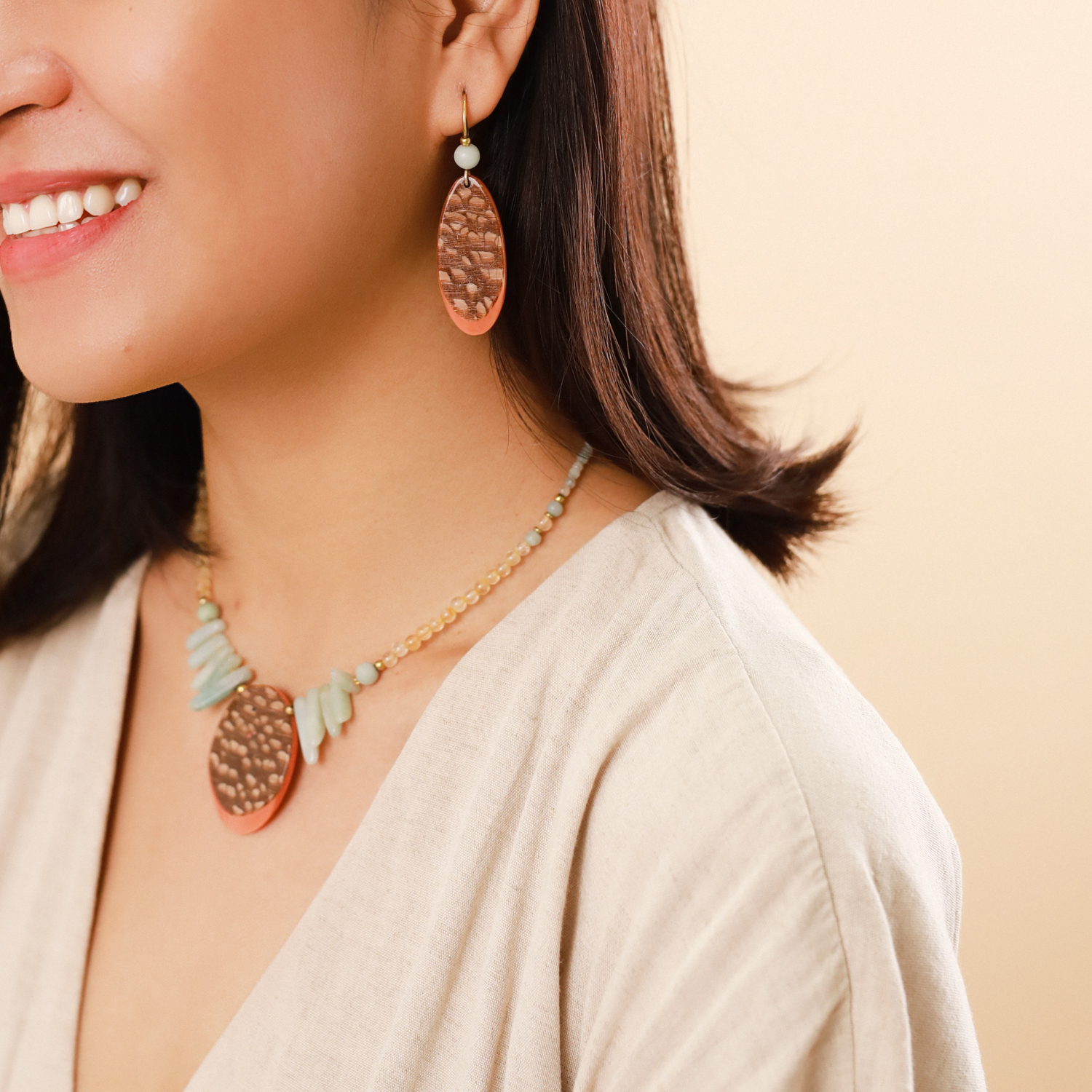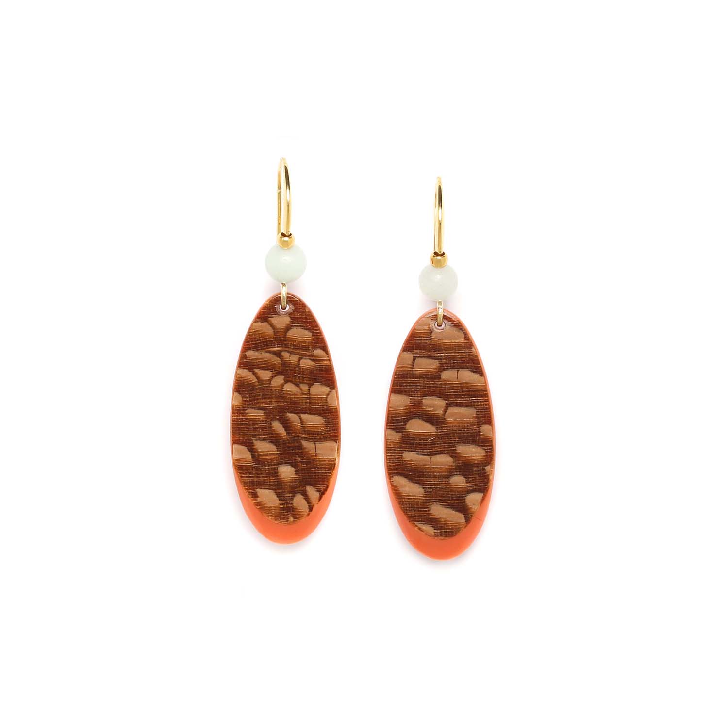 ფრანგული ბრენდი Nature Bijoux ს ხელნაკეთი საყურე, კოლექციიდან GALAPAGOS. სამკაულის ბაზად გამოყენებულია თითბერი, კოლექციაში გამოყენებული ნატურალური მასალები და ქვები: ციტრინი, ამაზონიტი, ოქროსფერი სადაფი, ხის ვინირი