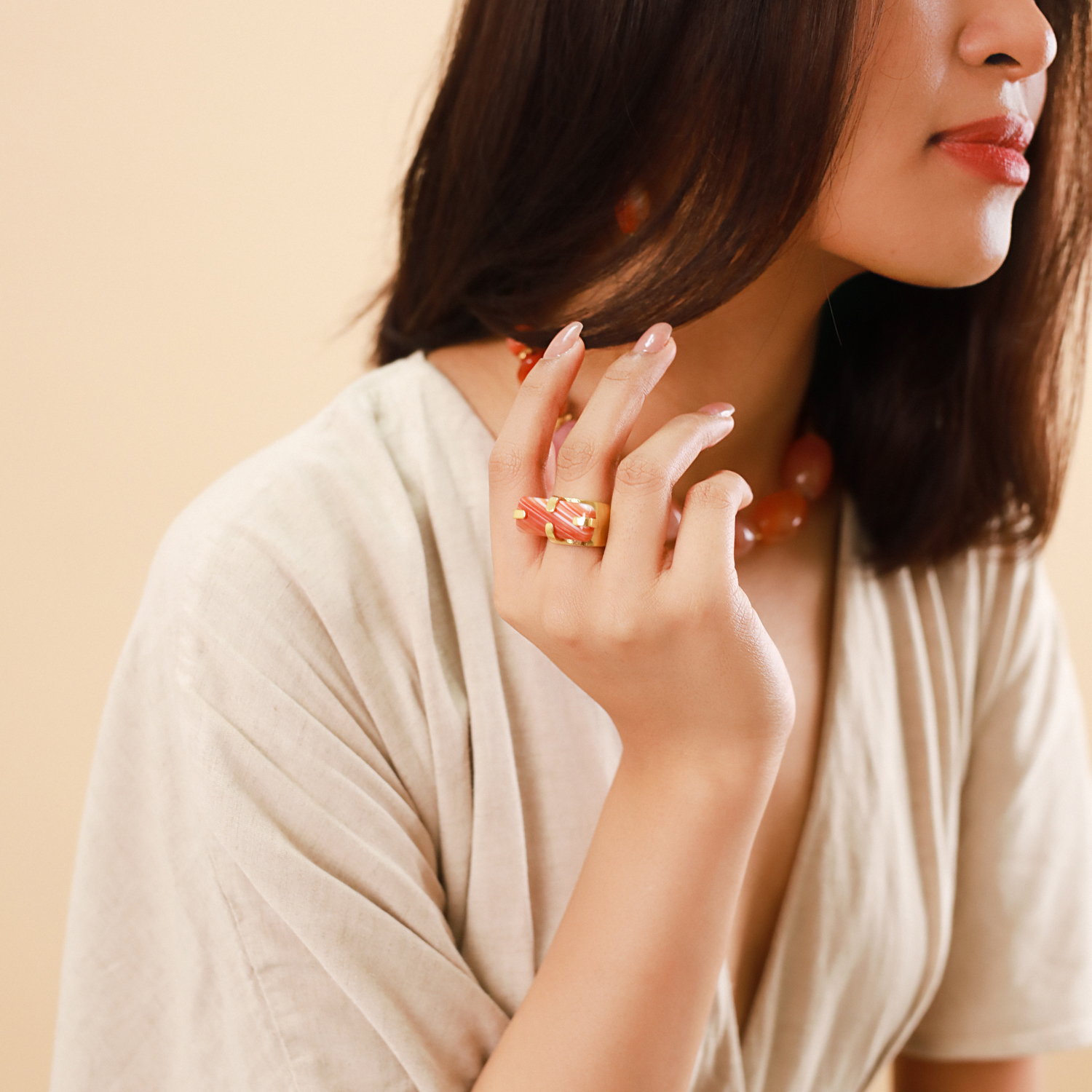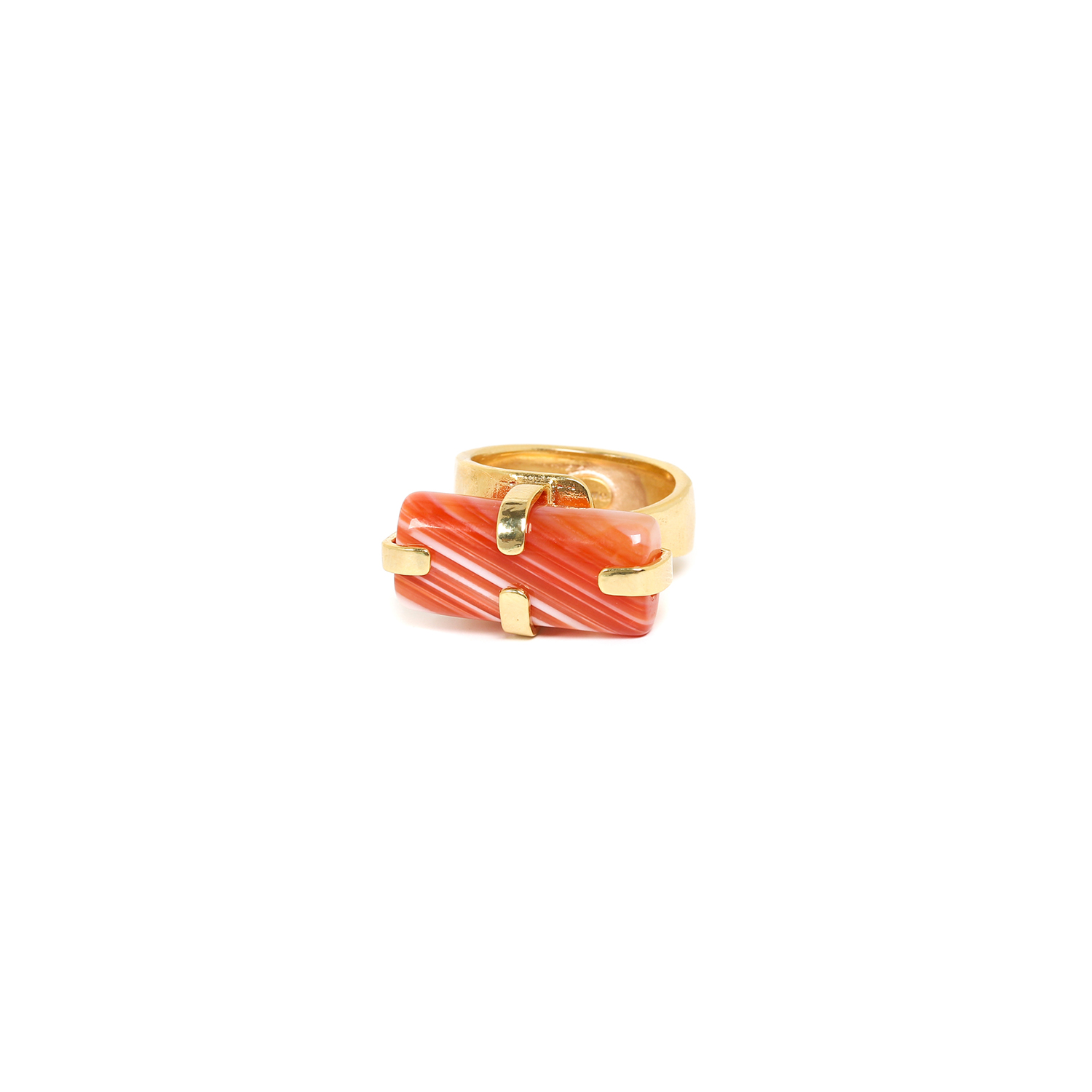 ფრანგული ბრენდი Nature Bijoux ს ხელნაკეთი ბეჭედი, კოლექციიდან AGATE. სამკაულის ბაზად გამოყენებულია თითბერი, კოლექციაში გამოყენებული ნატურალური მასალები და ქვები: ცეცხლოვანი აგატი.