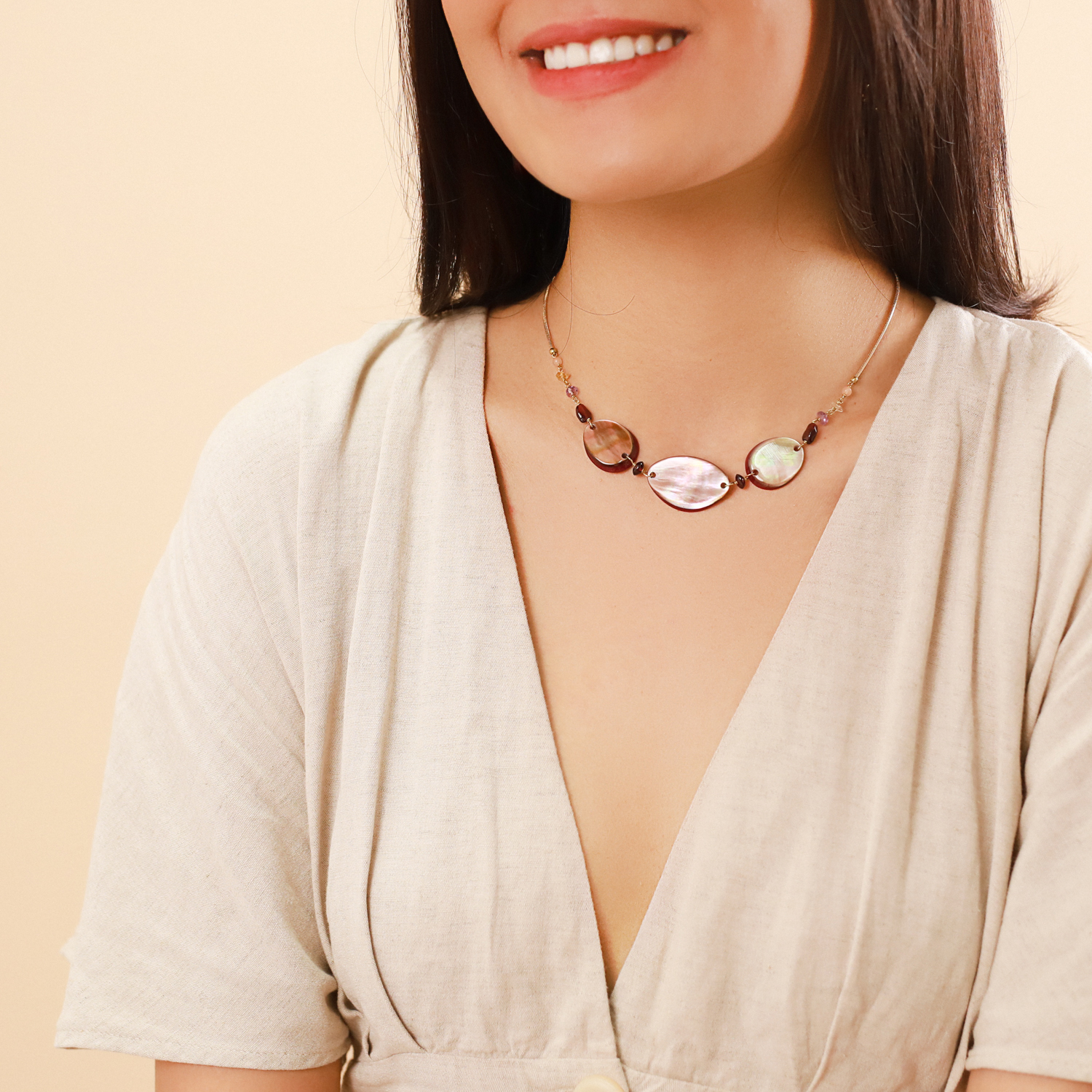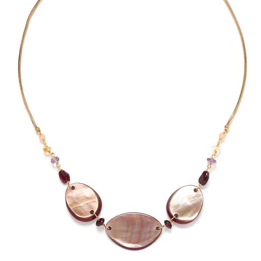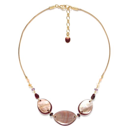 ფრანგული ბრენდი Nature Bijoux ს ხელნაკეთი ყელსაბამი, კოლექციიდან GRENADINE. სამკაულის ბაზად გამოყენებულია თითბერი, კოლექციაში გამოყენებული ნატურალური მასალები და ქვები: ამეთვისტო, ციტრინი, ძოწი, ნეფრიტი, ყავისფერი სადაფი