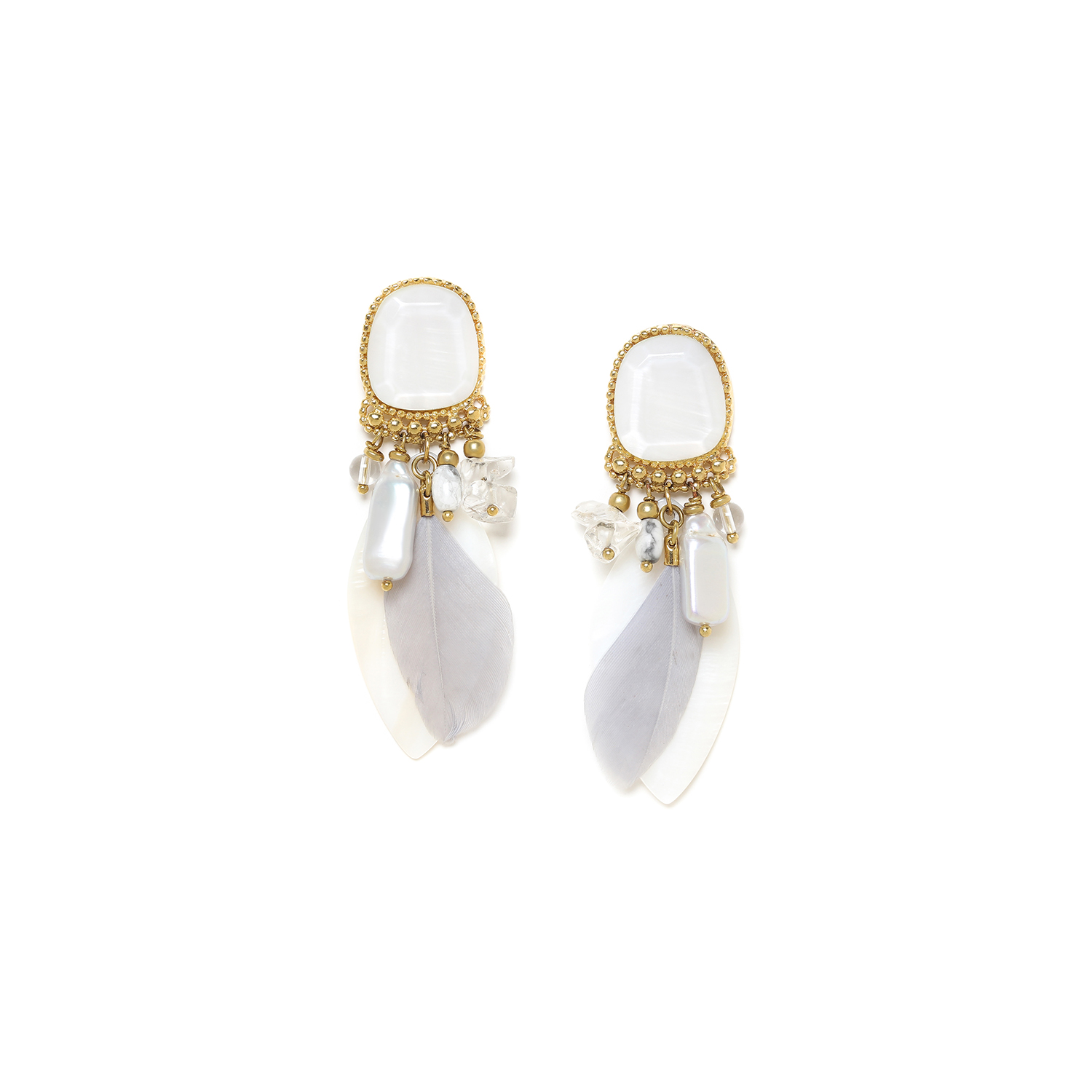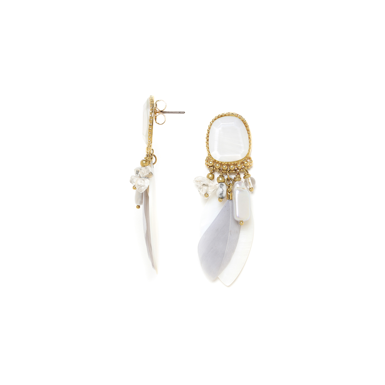 ფრანგული ბრენდი Nature Bijoux ს ხელნაკეთი საყურე, კოლექციიდან DARWIN. სამკაულის ბაზად გამოყენებულია თითბერი, კოლექციაში გამოყენებული ნატურალური მასალები და ქვები: მოლუსკის ნიჟარა, ჰაულიტი, მთის ბროლი, თეთრი სადაფი, ლავის ქვა, ხანჭკოლას მარცვლები, ტიბეტური ფირუზი, მარგალიტი, რქა, ნიჟარა.