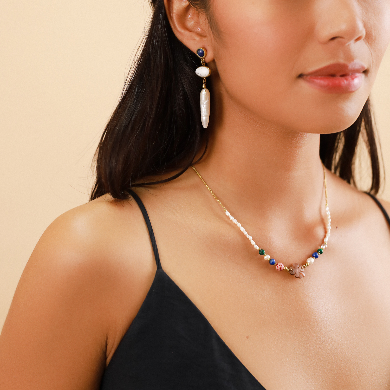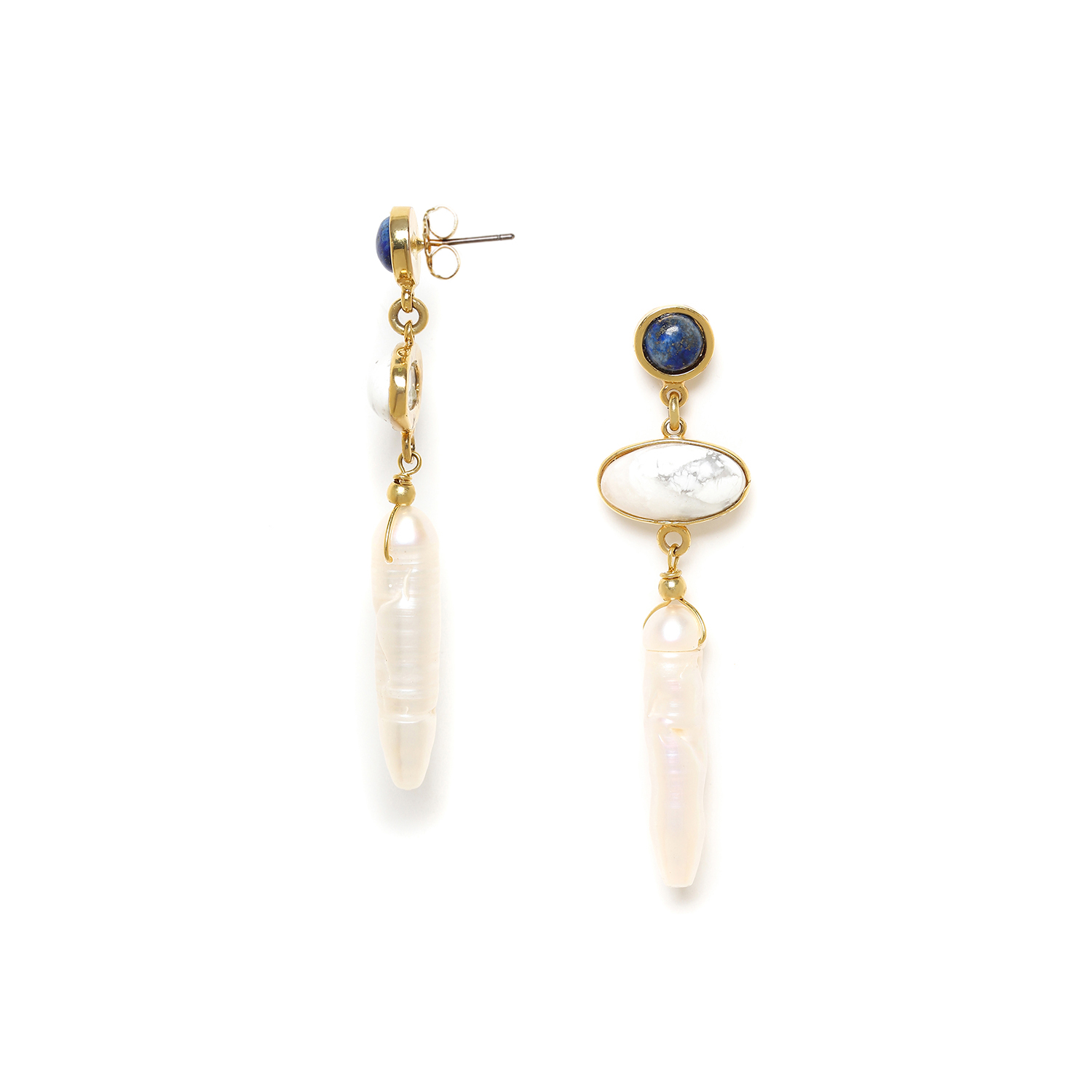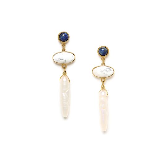 ფრანგული ბრენდი Nature Bijoux ს ხელნაკეთი საყურე, კოლექციიდან INTUITION. სამკაულის ბაზად გამოყენებულია თითბერი, კოლექციაში გამოყენებული ნატურალური მასალები და ქვები: შავი სადაფი, მწვანე იასპი, მარგალიტი, მთის ბროლი, მალაქიტი, ვეფხვის თვალი, ჰაულიტი.