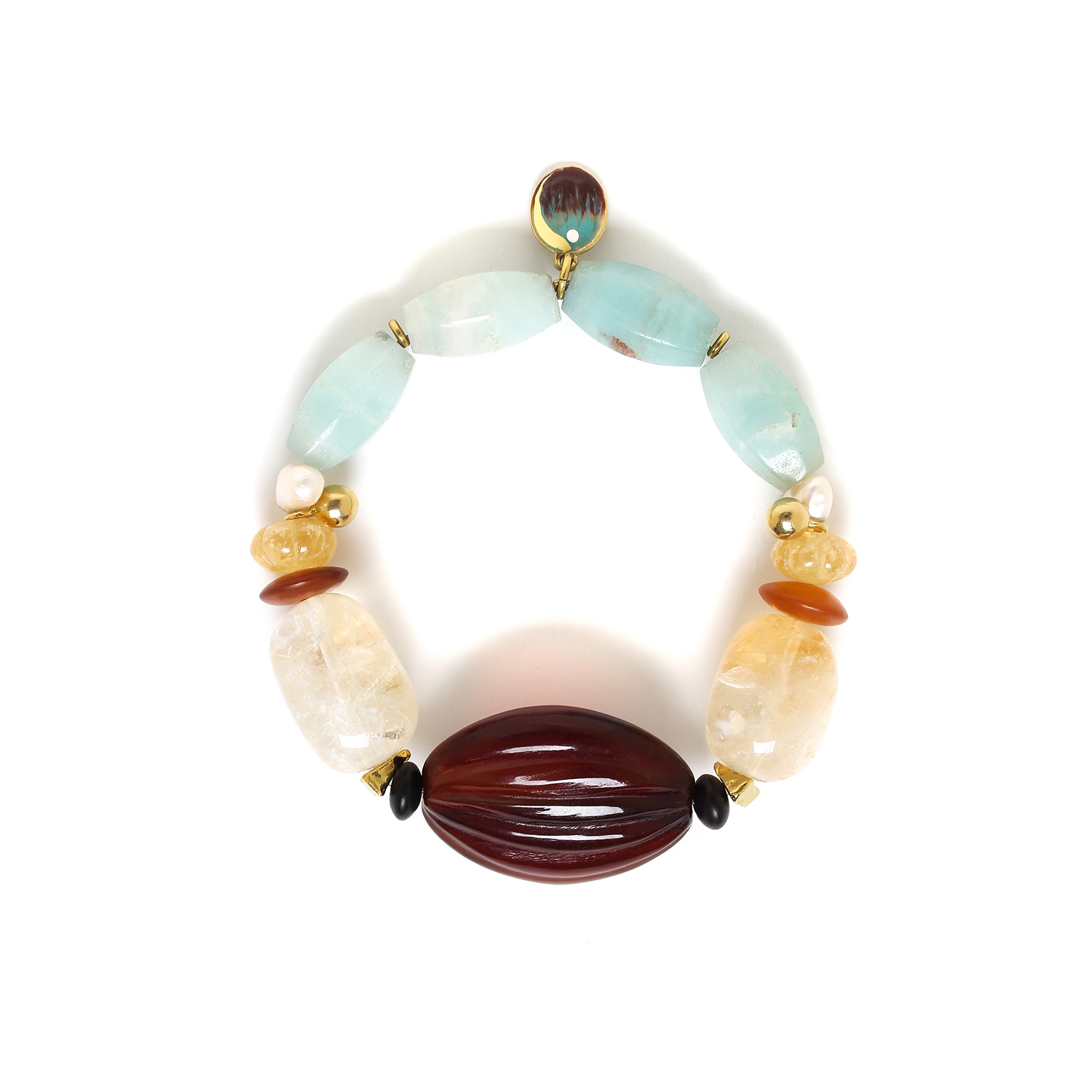 ფრანგული ბრენდი Nature Bijoux ს ხელნაკეთი სამაჯური, კოლექციიდან OKINAWA. სამკაულის ბაზად გამოყენებულია თითბერი, კოლექციაში გამოყენებული ნატურალური მასალები და ქვები: ციტრინი, ამაზონიტი, რქა, მარგალიტი