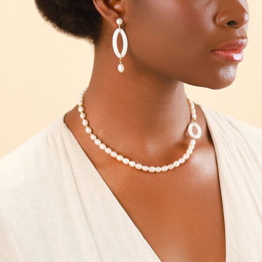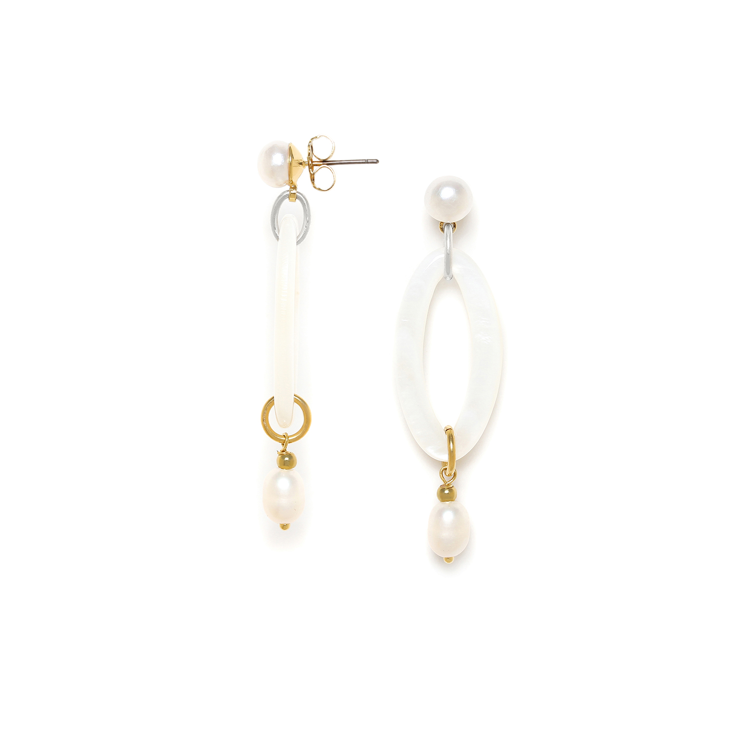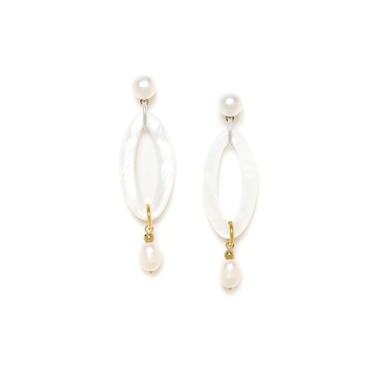 ფრანგული ბრენდი Nature Bijoux ს ხელნაკეთი საყურე, კოლექციიდან OZUKA. სამკაულის ბაზად გამოყენებულია თითბერი, კოლექციაში გამოყენებული ნატურალური მასალები და ქვები: მარგალიტი, ვარდისფერი ნიჟარა