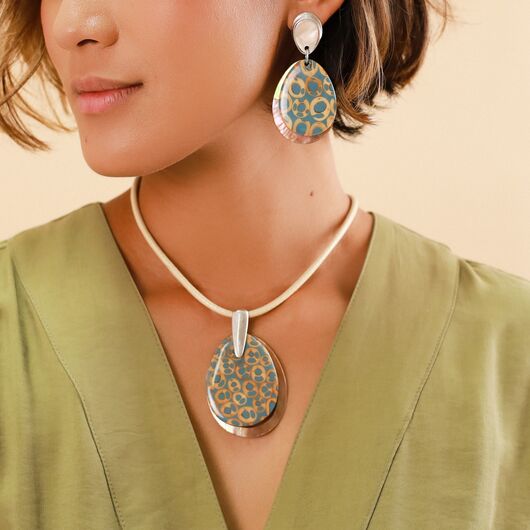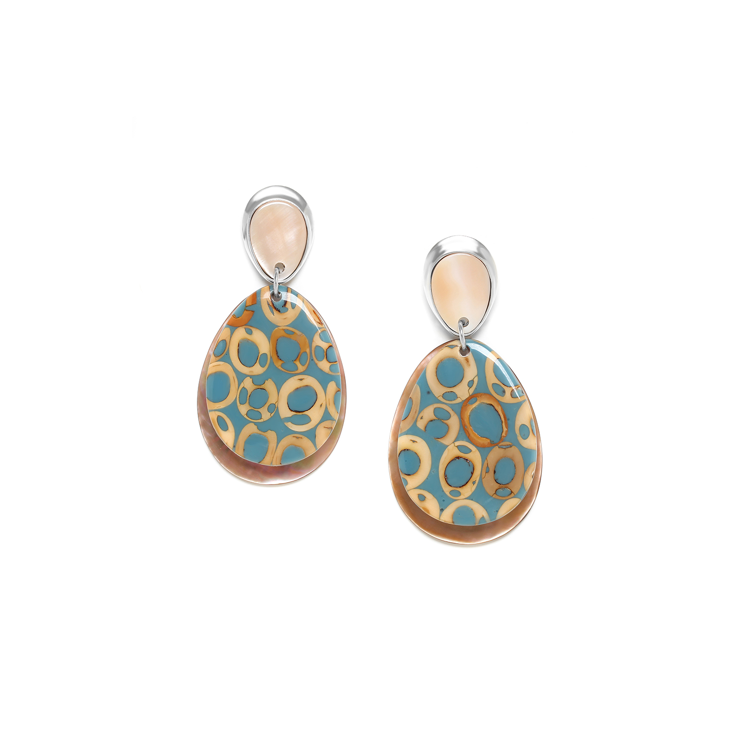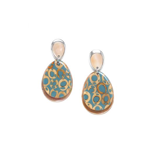 ფრანგული ბრენდი Nature Bijoux ს ხელნაკეთი საყურე, კოლექციიდან PICCADILLY. სამკაულის ბაზად გამოყენებულია თითბერი, კოლექციაში გამოყენებული ნატურალური მასალები და ქვები: პალმის მარცვლები, ყავისფერი სადაფი, თეთრი სადაფი