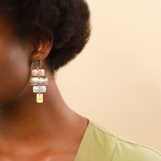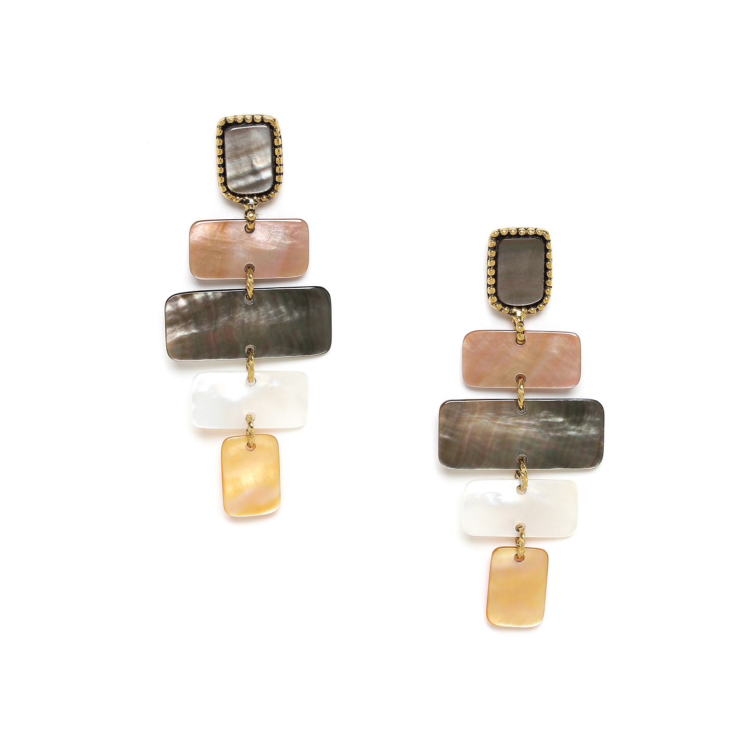 ფრანგული ბრენდი Nature Bijoux ს ხელნაკეთი საყურე, კოლექციიდან VENDOME. სამკაულის ბაზად გამოყენებულია თითბერი, კოლექციაში გამოყენებული ნატურალური მასალები და ქვები: თეთრი სადაფი, შავი სადაფი, ყავისფერი სადაფი, ოქროსფერი სადაფი