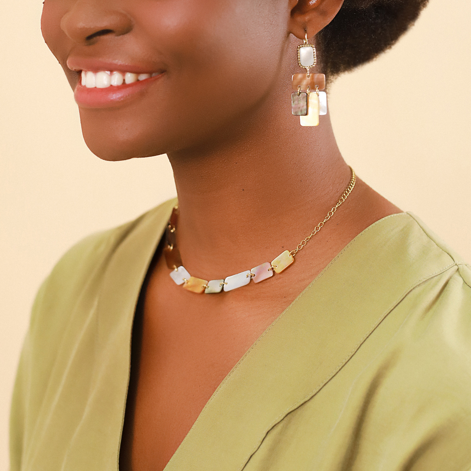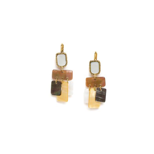 ფრანგული ბრენდი Nature Bijoux ს ხელნაკეთი საყურე, კოლექციიდან VENDOME. სამკაულის ბაზად გამოყენებულია თითბერი, კოლექციაში გამოყენებული ნატურალური მასალები და ქვები: თეთრი სადაფი, შავი სადაფი, ყავისფერი სადაფი, ოქროსფერი სადაფი
