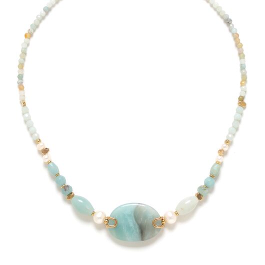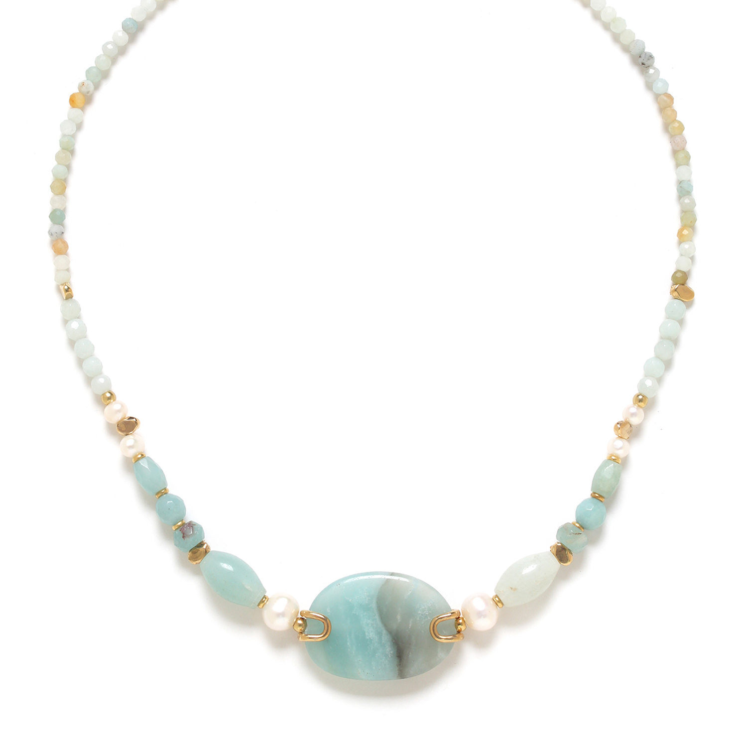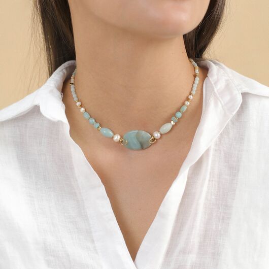 ფრანგული ბრენდი Nature Bijoux ს ხელნაკეთი ყელსაბამი, კოლექციიდან HONOLULU. სამკაულის ბაზად გამოყენებულია თითბერი, კოლექციაში გამოყენებული ნატურალური მასალები და ქვები: ამაზონიტი, მარგალიტი.