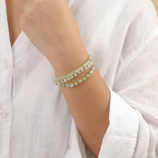 ფრანგული ბრენდი Nature Bijoux ს ხელნაკეთი სამაჯური, კოლექციიდან PAPYRUS. სამკაულის ბაზად გამოყენებულია თითბერი, კოლექციაში გამოყენებული ნატურალური მასალები და ქვები: ნეფრიტი, ქვიშა, კონუსისებრი ნიჟარა