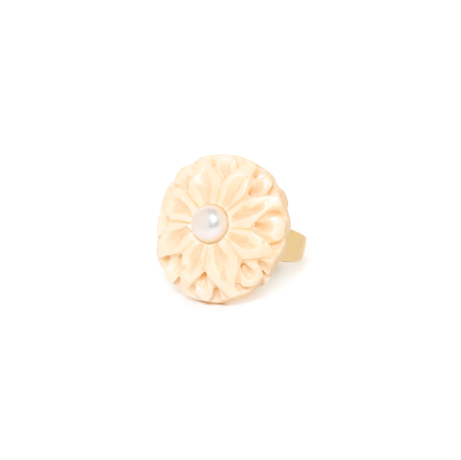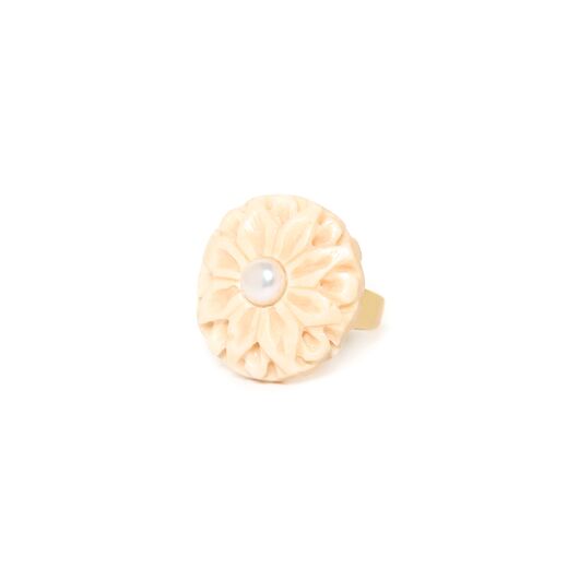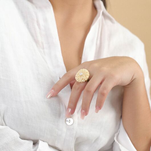 ფრანგული ბრენდი Nature Bijoux ს ხელნაკეთი ბეჭედი, კოლექციიდან PONDICHERY. სამკაულის ბაზად გამოყენებულია თითბერი, კოლექციაში გამოყენებული ნატურალური მასალები და ქვები: აგატი, ძვალი, ქოქოსის ხე, მთის ბროლი, მარგალიტი, ჰაულიტი, ხაზებიანი ნიჟარა , ვარდისფერი ნიჟარა