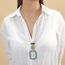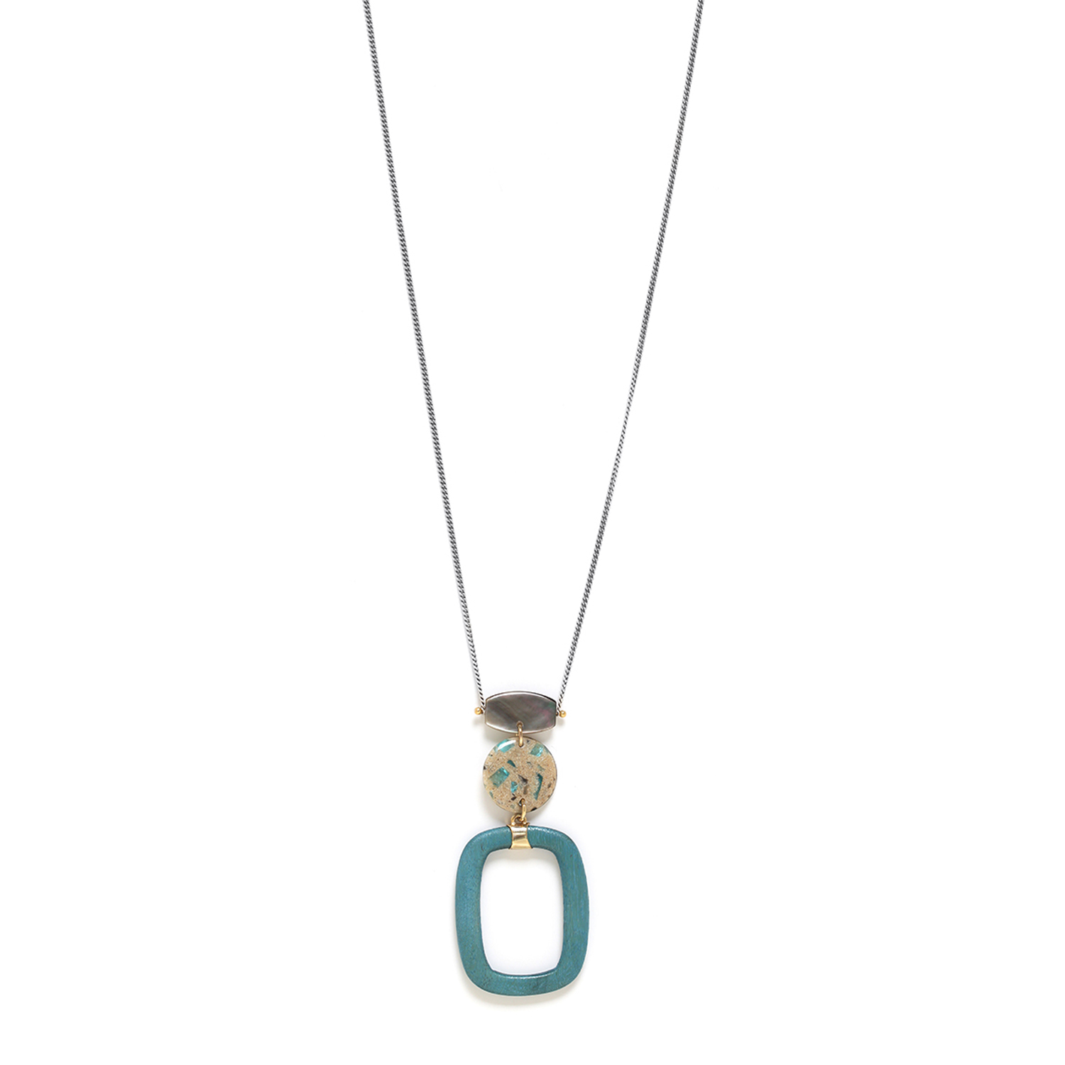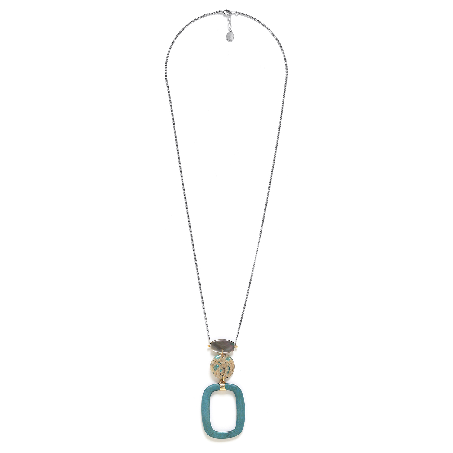 ფრანგული ბრენდი Nature Bijoux ს ხელნაკეთი ყელსაბამი, კოლექციიდან SOLENZARA. სამკაულის ბაზად გამოყენებულია თითბერი, კოლექციაში გამოყენებული ნატურალური მასალები და ქვები: მარგალიტი, ტყავი, ჰაულიტი, ქვიშა, თამარიდი