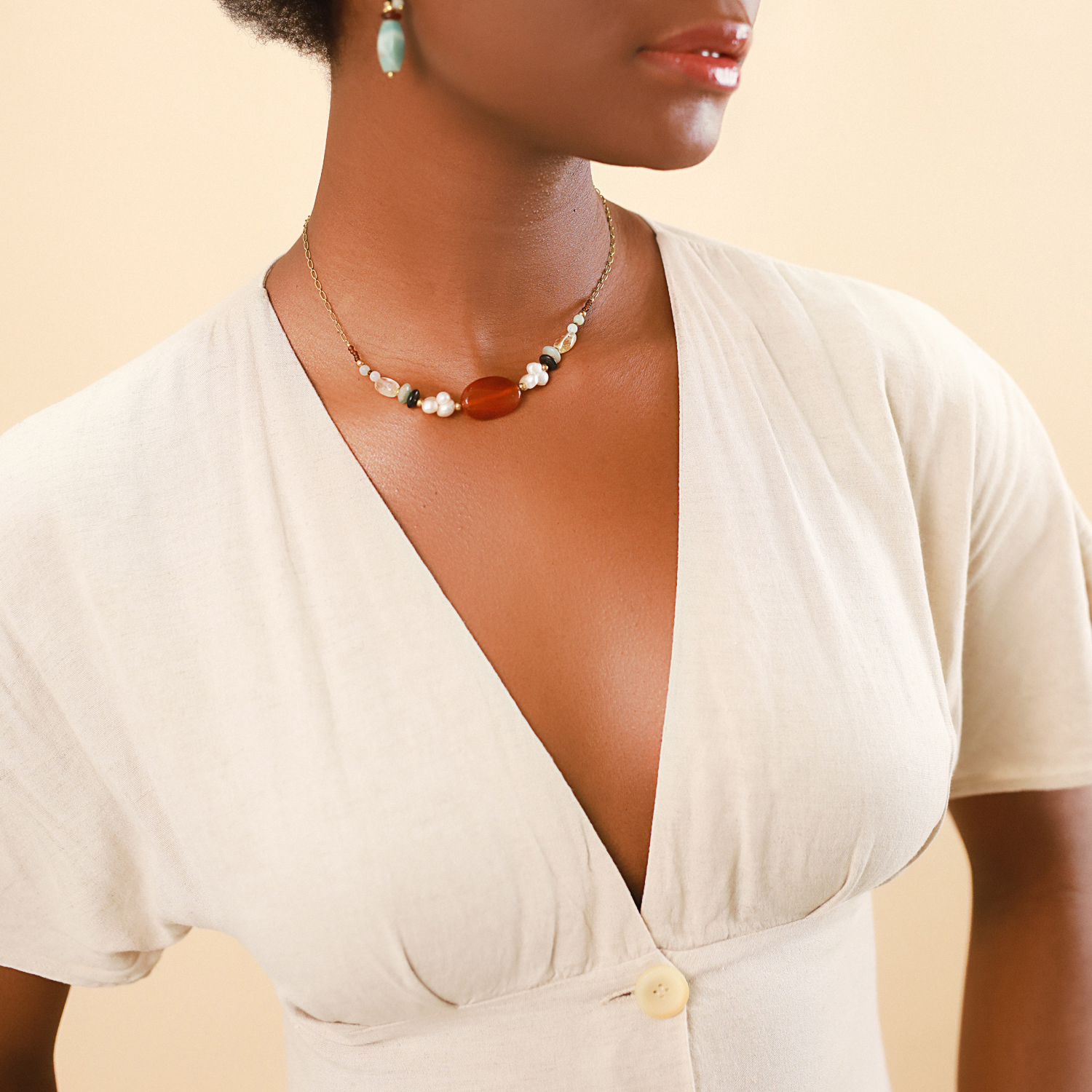 ფრანგული ბრენდი Nature Bijoux ს ხელნაკეთი ყელსაბამი, კოლექციიდან OKINAWA. სამკაულის ბაზად გამოყენებულია თითბერი, კოლექციაში გამოყენებული ნატურალური მასალები და ქვები: ციტრინი, ამაზონიტი, რქა, მარგალიტი