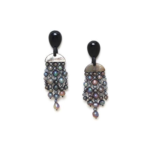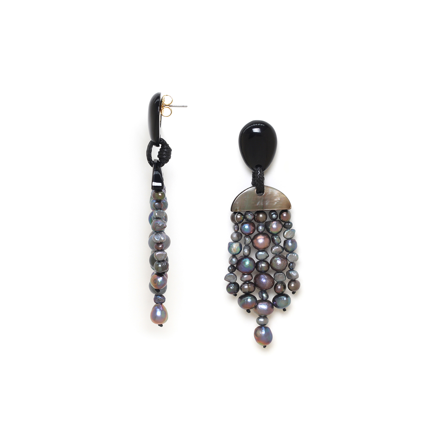 ფრანგული ბრენდი Nature Bijoux ს ხელნაკეთი საყურე, კოლექციიდან BLUE PEARL. სამკაულის ბაზად გამოყენებულია თითბერი, კოლექციაში გამოყენებული ნატურალური მასალები და ქვები: სადაფი, რქა, ტყავი, მარგალიტი.