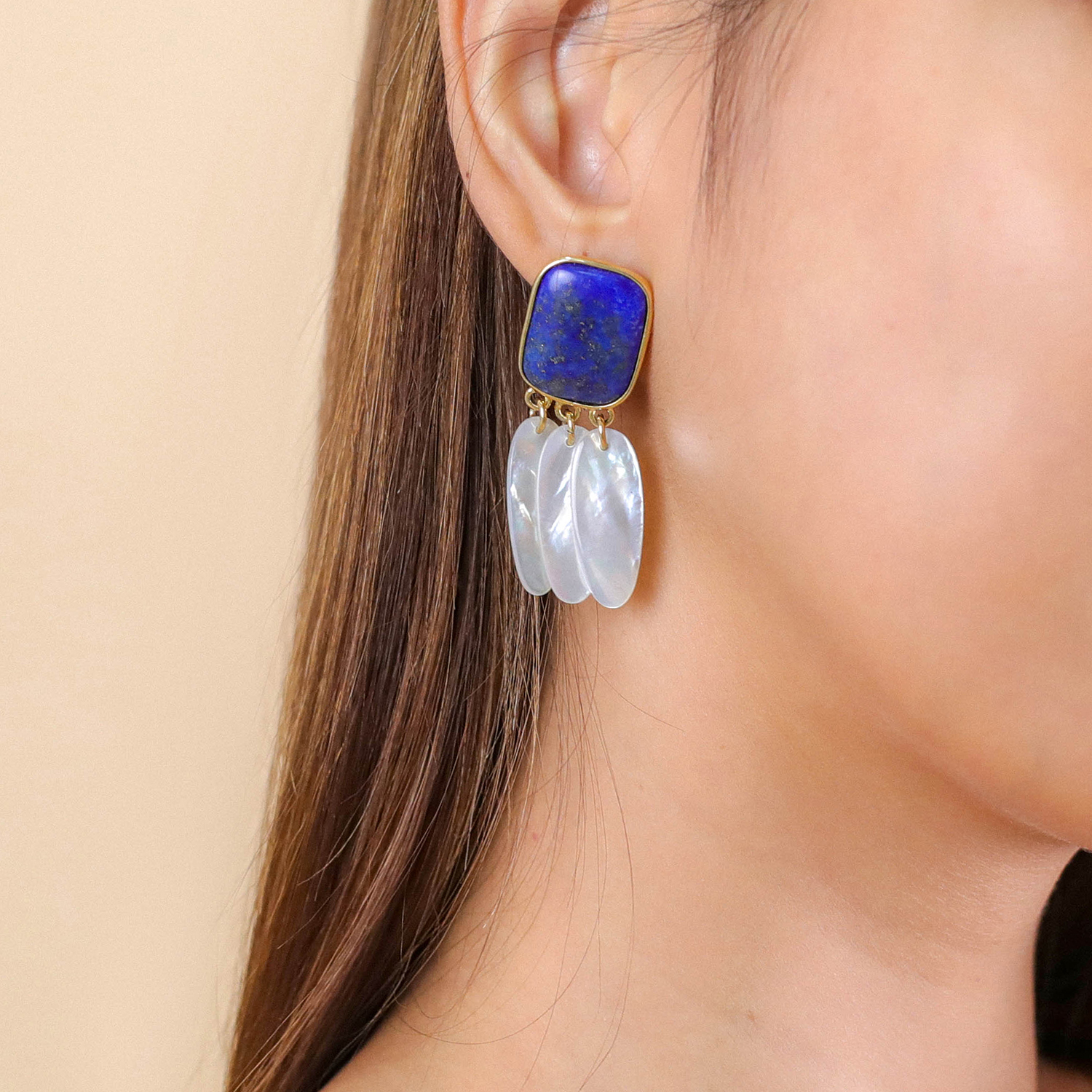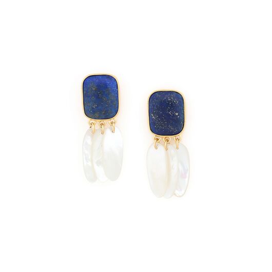 ფრანგული ბრენდი Nature Bijoux ს ხელნაკეთი საყურე, კოლექციიდან COBALT. სამკაულის ბაზად გამოყენებულია თითბერი, კოლექციაში გამოყენებული ნატურალური მასალები და ქვები: ლაზურიტი, თეთრი სადაფი.