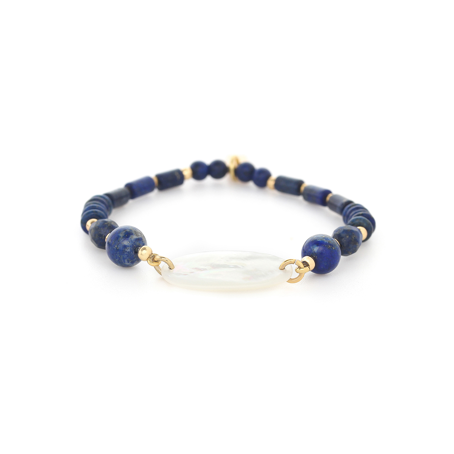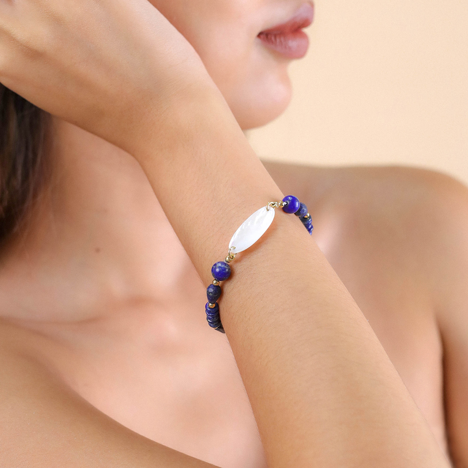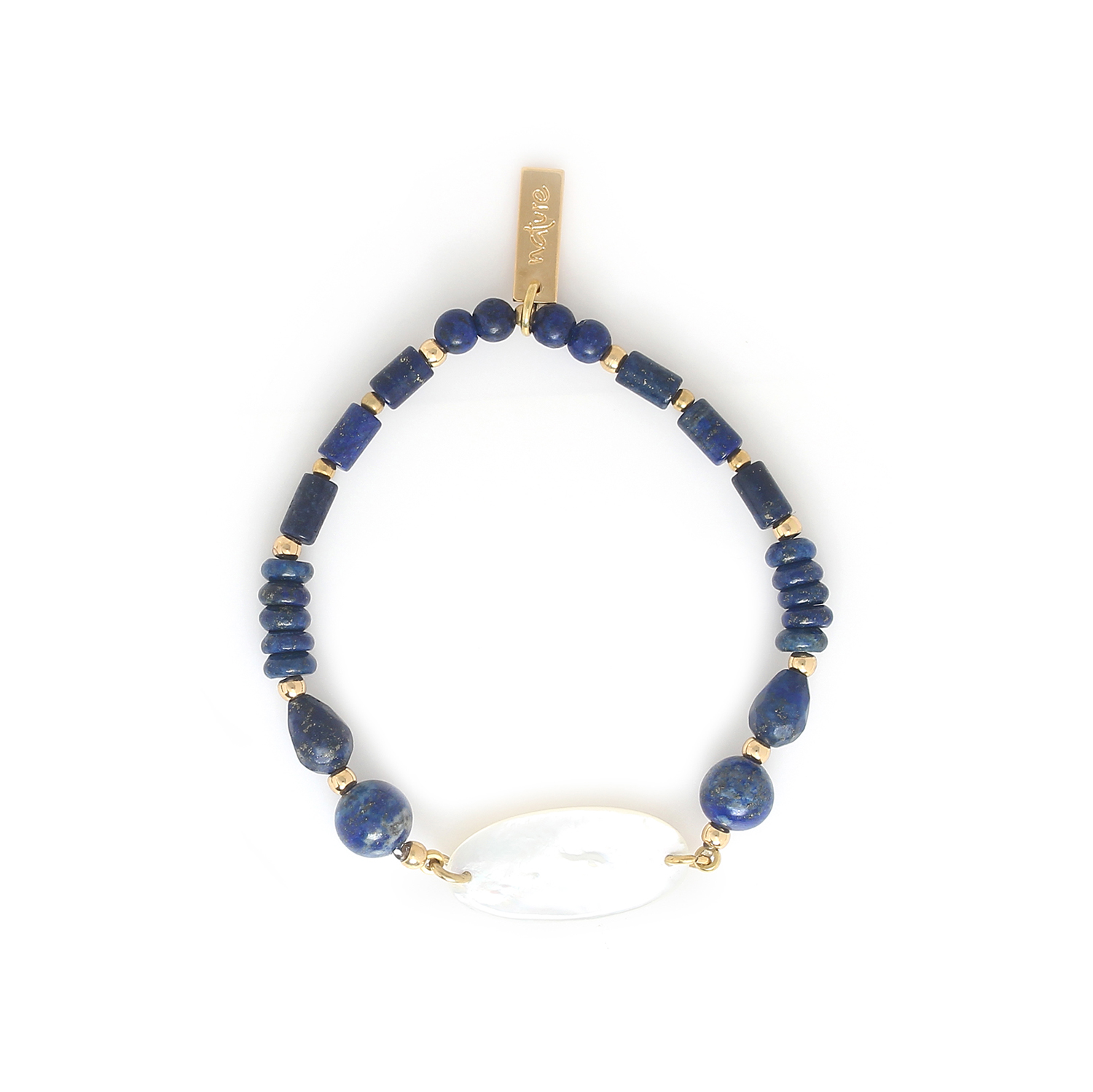 ფრანგული ბრენდი Nature Bijoux ს ხელნაკეთი სამაჯური, კოლექციიდან COBALT. სამკაულის ბაზად გამოყენებულია თითბერი, კოლექციაში გამოყენებული ნატურალური მასალები და ქვები: ლაზურიტი, თეთრი სადაფი.