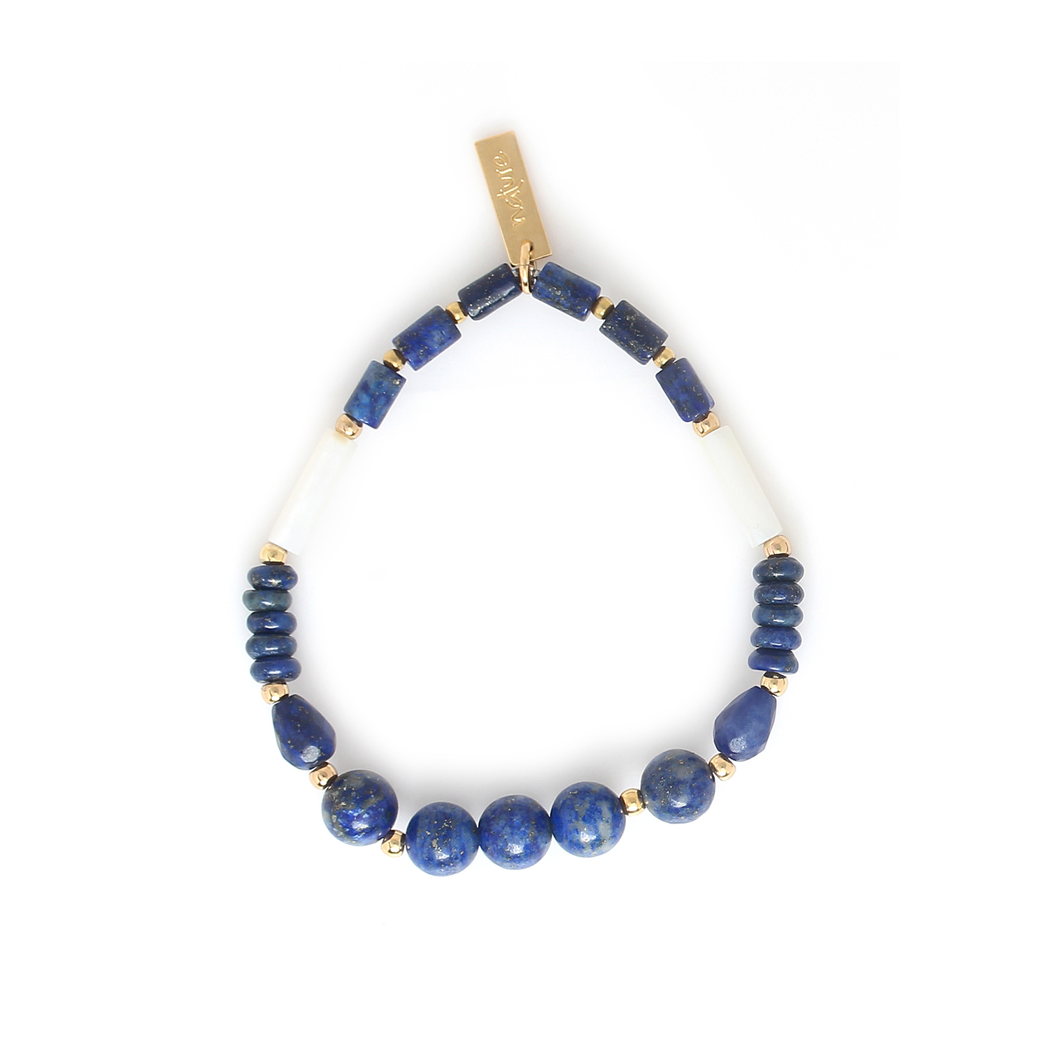 ფრანგული ბრენდი Nature Bijoux ს ხელნაკეთი სამაჯური, კოლექციიდან COBALT. სამკაულის ბაზად გამოყენებულია თითბერი, კოლექციაში გამოყენებული ნატურალური მასალები და ქვები: ლაზურიტი, თეთრი სადაფი.