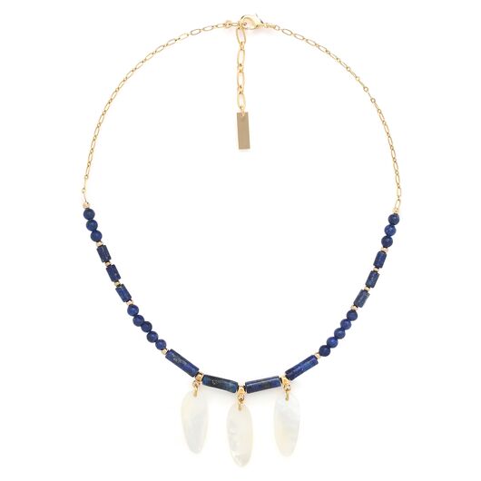ფრანგული ბრენდი Nature Bijoux ს ხელნაკეთი ყელსაბამი, კოლექციიდან COBALT. სამკაულის ბაზად გამოყენებულია თითბერი, კოლექციაში გამოყენებული ნატურალური მასალები და ქვები: ლაზურიტი, თეთრი სადაფი.