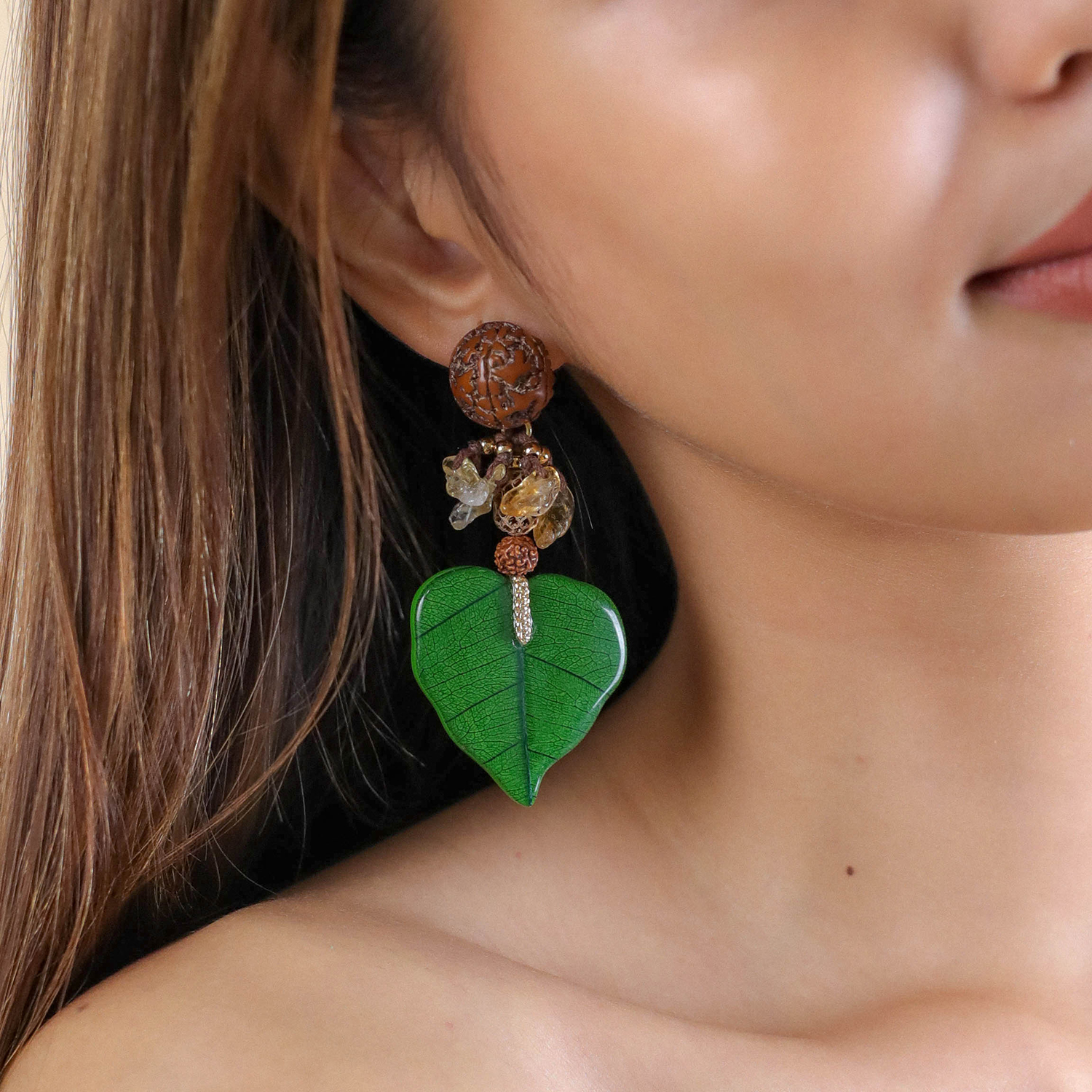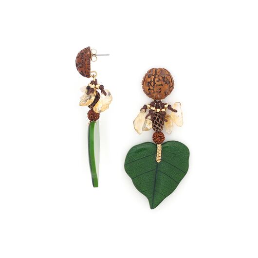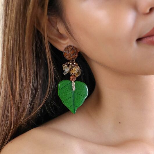 ფრანგული ბრენდი Nature Bijoux ს ხელნაკეთი საყურე, კოლექციიდან KIRINDY. სამკაულის ბაზად გამოყენებულია თითბერი, კოლექციაში გამოყენებული ნატურალური მასალები და ქვები: წითელი აგატი, ციტრინი,პალმის ნაყოფის მარცვლები,ყავისფერი იასპი,მცენარის თესლი, ნეფრიტი, ფიჭვის თესლი,ფოთოლი,პურის ხის მარცვლები.