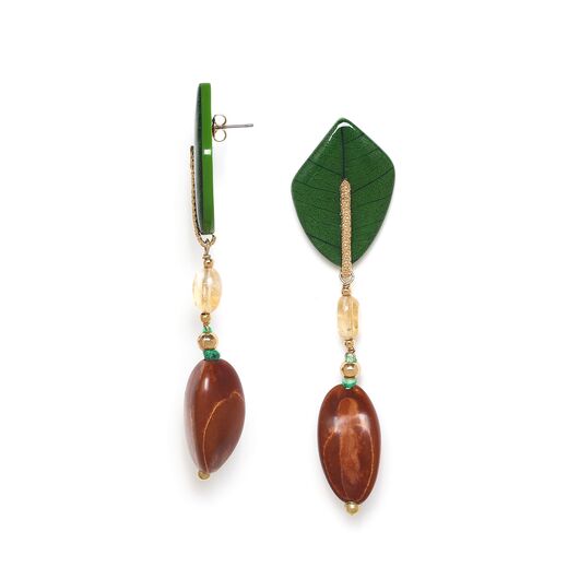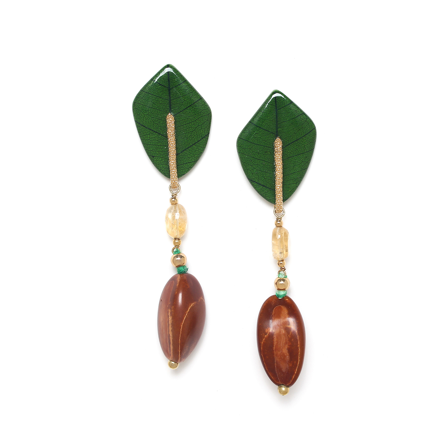 ფრანგული ბრენდი Nature Bijoux ს ხელნაკეთი საყურე, კოლექციიდან KIRINDY. სამკაულის ბაზად გამოყენებულია თითბერი, კოლექციაში გამოყენებული ნატურალური მასალები და ქვები: წითელი აგატი, ციტრინი,პალმის ნაყოფის მარცვლები,ყავისფერი იასპი,მცენარის თესლი, ნეფრიტი, ფიჭვის თესლი,ფოთოლი,პურის ხის მარცვლები.
