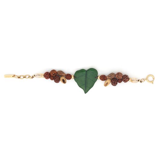 ფრანგული ბრენდი Nature Bijoux ს ხელნაკეთი სამაჯური, კოლექციიდან KIRINDY. სამკაულის ბაზად გამოყენებულია თითბერი, კოლექციაში გამოყენებული ნატურალური მასალები და ქვები: წითელი აგატი, ციტრინი,პალმის ნაყოფის მარცვლები,ყავისფერი იასპი,მცენარის თესლი, ნეფრიტი, ფიჭვის თესლი,ფოთოლი,პურის ხის მარცვლები.