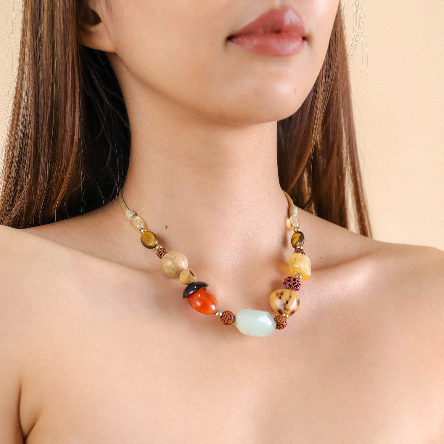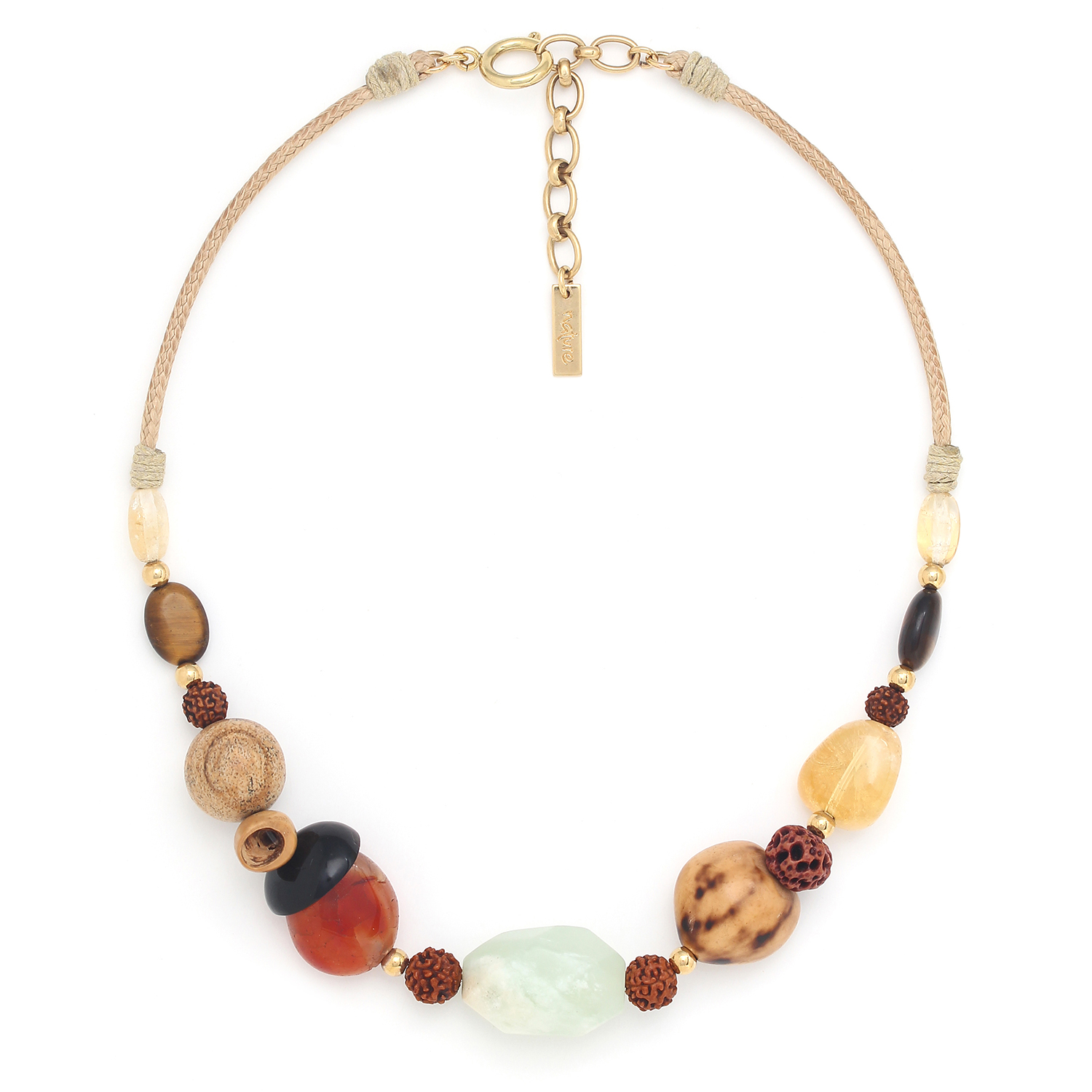 ფრანგული ბრენდი Nature Bijoux ს ხელნაკეთი ყელსაბამი, კოლექციიდან KIRINDY. სამკაულის ბაზად გამოყენებულია თითბერი, კოლექციაში გამოყენებული ნატურალური მასალები და ქვები: წითელი აგატი, ციტრინი,პალმის ნაყოფის მარცვლები,ყავისფერი იასპი,მცენარის თესლი, ნეფრიტი, ფიჭვის თესლი,ფოთოლი,პურის ხის მარცვლები.