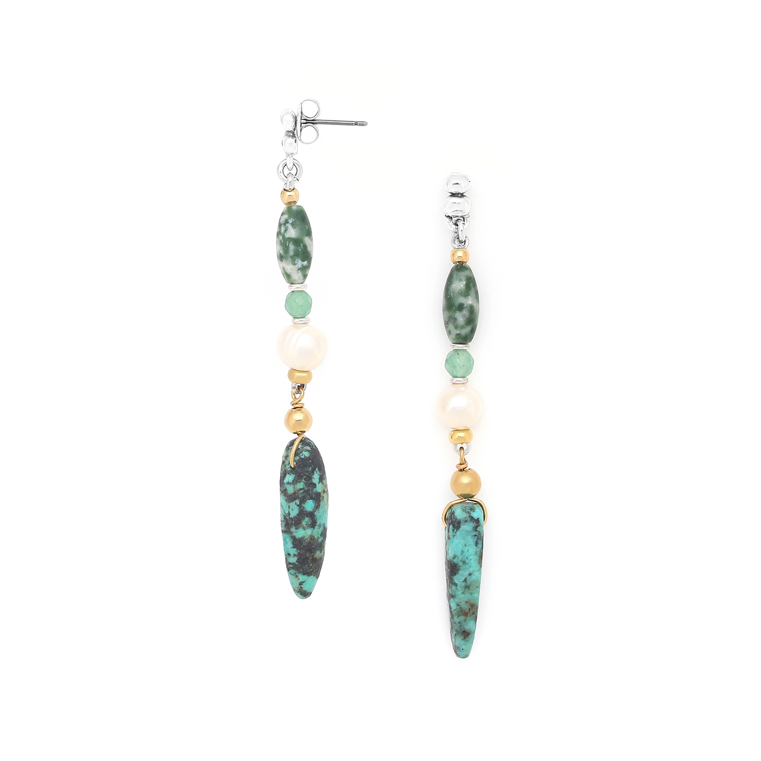 ფრანგული ბრენდი Nature Bijoux ს ხელნაკეთი საყურე, კოლექციიდან MARA. სამკაულის ბაზად გამოყენებულია თითბერი, კოლექციაში გამოყენებული ნატურალური მასალები და ქვები: აგატი, ავანტურინი,მარგალიტი, იასპი, აფრიკული ფირუზი.