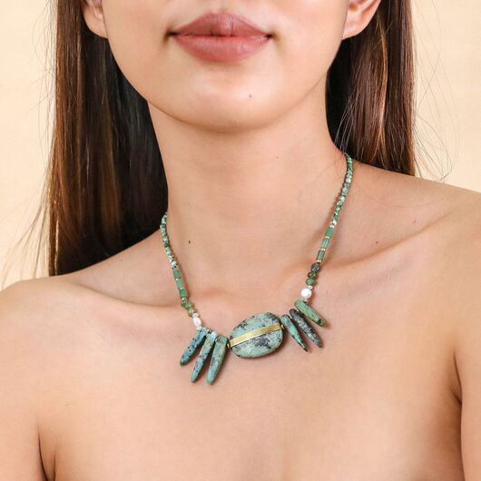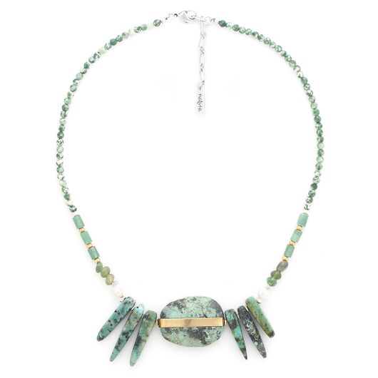 ფრანგული ბრენდი Nature Bijoux ს ხელნაკეთი ყელსაბამი, კოლექციიდან MARA. სამკაულის ბაზად გამოყენებულია თითბერი, კოლექციაში გამოყენებული ნატურალური მასალები და ქვები: აგატი, ავანტურინი,მარგალიტი, იასპი, აფრიკული ფირუზი.