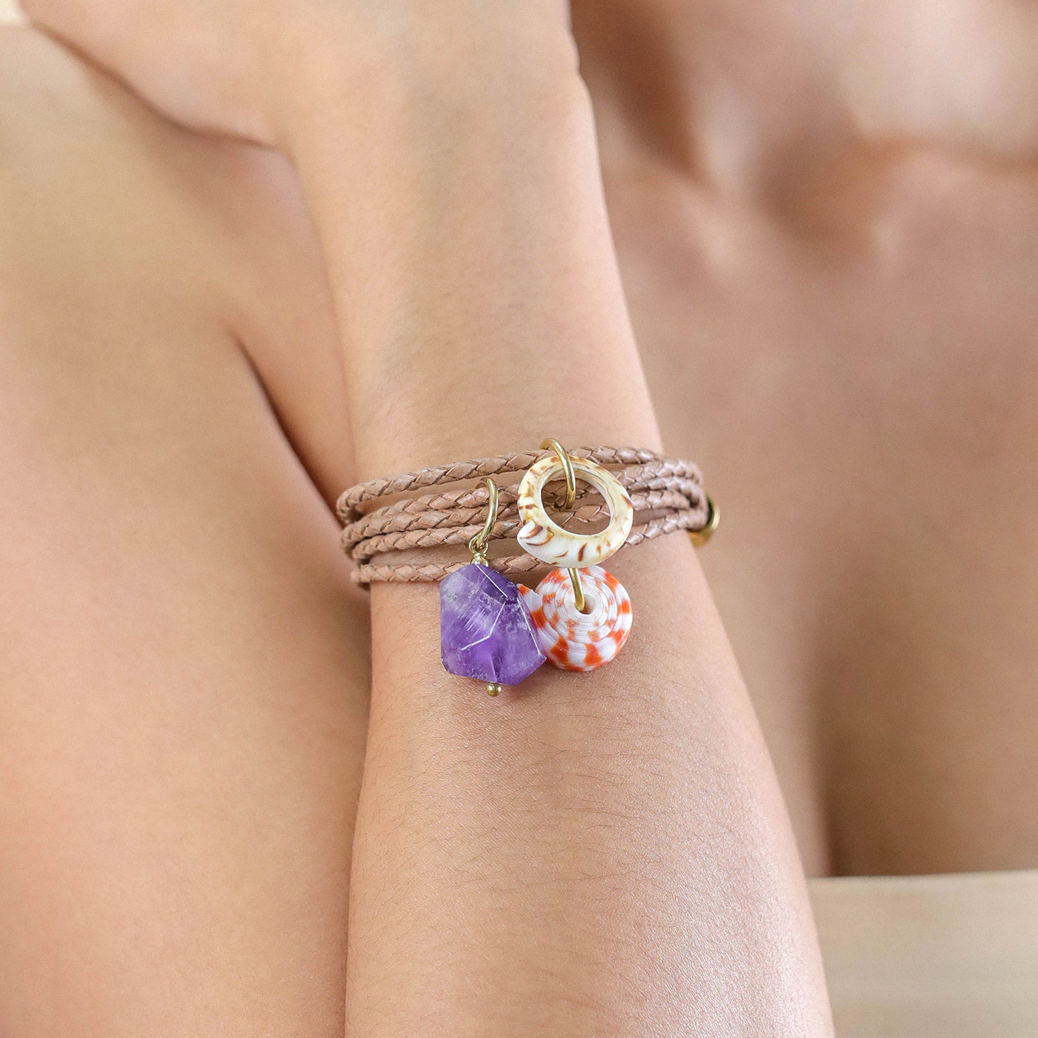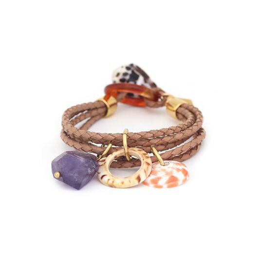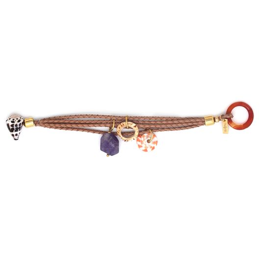 ფრანგული ბრენდი Nature Bijoux ს ხელნაკეთი სამაჯური, კოლექციიდან St BARTH. სამკაულის ბაზად გამოყენებულია თითბერი, კოლექციაში გამოყენებული ნატურალური მასალები და ქვები: წითელი აგატი, ამეთვისტო, ბოდის მარცვლები, კოპლებიანი ნიჟარა, კონუსისებრი ნიჟარა,ზღვის ზღარბის ეკალი,ზღვის მოლუსკი,თამარინდი.
