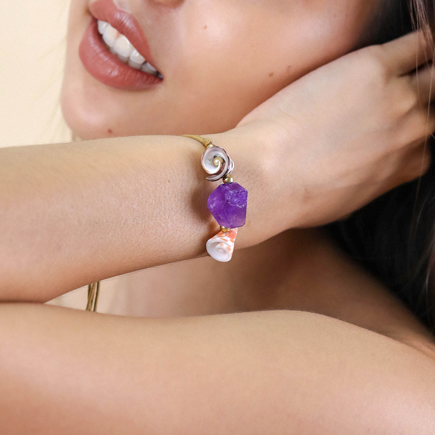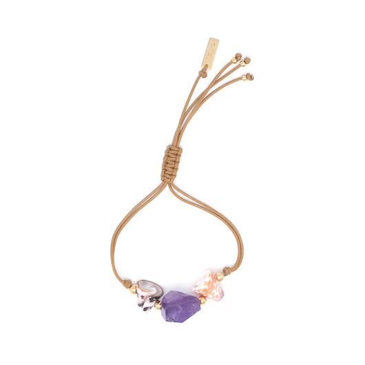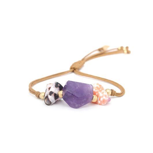 ფრანგული ბრენდი Nature Bijoux ს ხელნაკეთი სამაჯური, კოლექციიდან St BARTH. სამკაულის ბაზად გამოყენებულია თითბერი, კოლექციაში გამოყენებული ნატურალური მასალები და ქვები: წითელი აგატი, ამეთვისტო, ბოდის მარცვლები, კოპლებიანი ნიჟარა, კონუსისებრი ნიჟარა,ზღვის ზღარბის ეკალი,ზღვის მოლუსკი,თამარინდი.