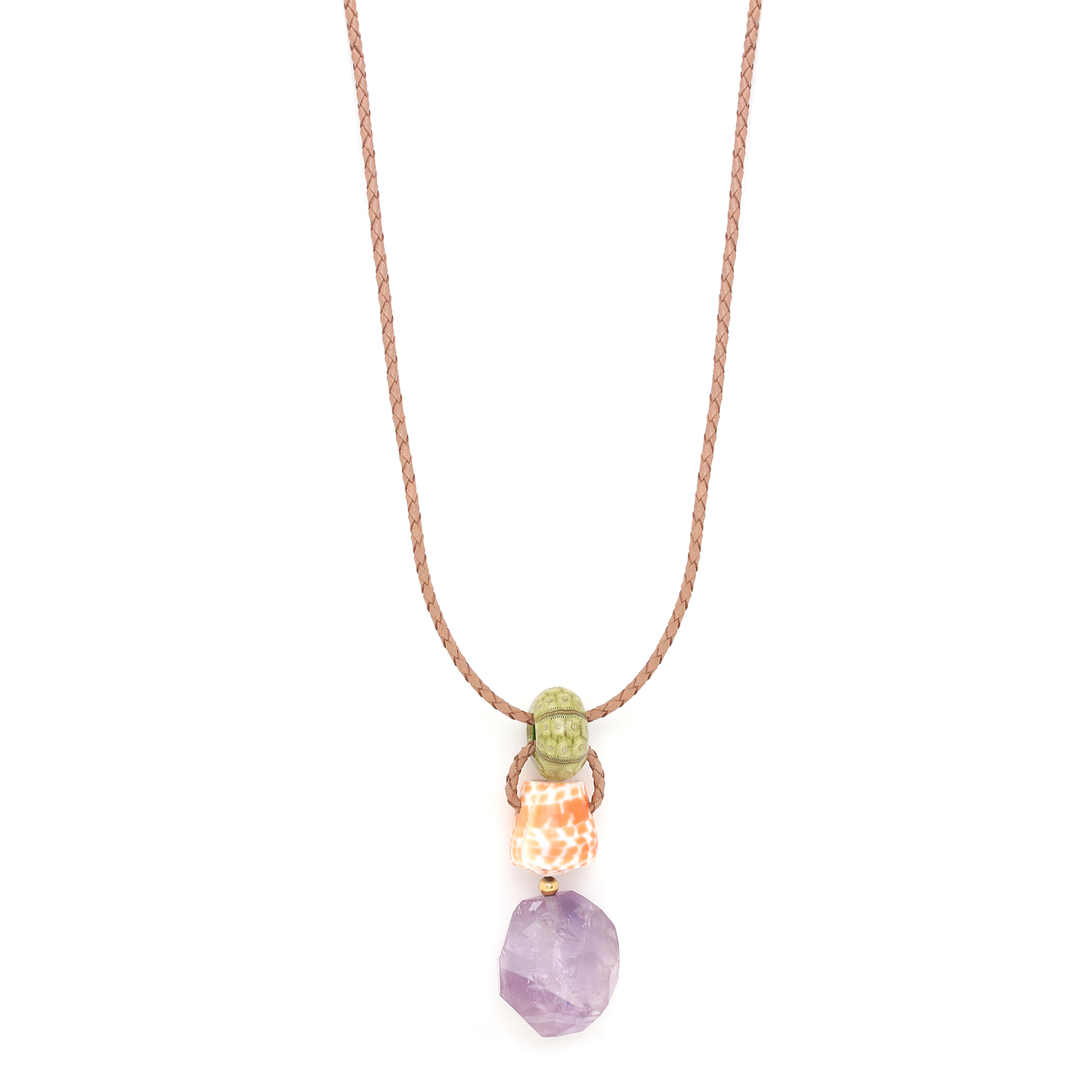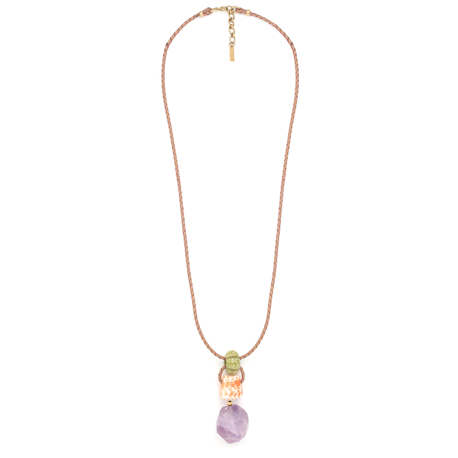 ფრანგული ბრენდი Nature Bijoux ს ხელნაკეთი ყელსაბამი, კოლექციიდან St BARTH. სამკაულის ბაზად გამოყენებულია თითბერი, კოლექციაში გამოყენებული ნატურალური მასალები და ქვები: წითელი აგატი, ამეთვისტო, ბოდის მარცვლები, კოპლებიანი ნიჟარა, კონუსისებრი ნიჟარა,ზღვის ზღარბის ეკალი,ზღვის მოლუსკი,თამარინდი.