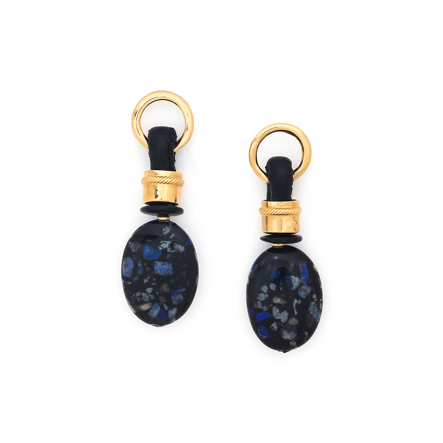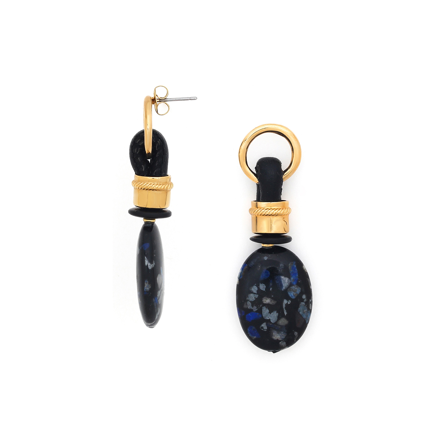ფრანგული ბრენდი Nature Bijoux ს ხელნაკეთი საყურე, კოლექციიდან VENEZIA. სამკაულის ბაზად გამოყენებულია თითბერი, კოლექციაში გამოყენებული ნატურალური მასალები და ქვები: აგატი, ქოქოსის ხე, ლაზურიტი, ტყავი, ლაქებიანი იასპი.