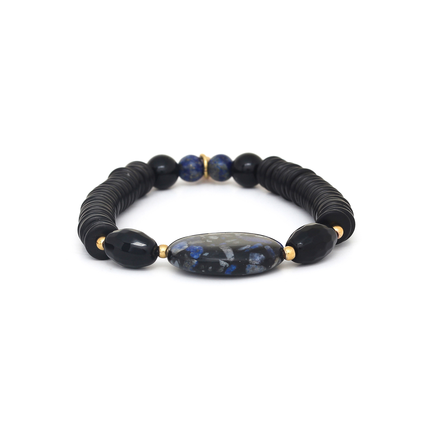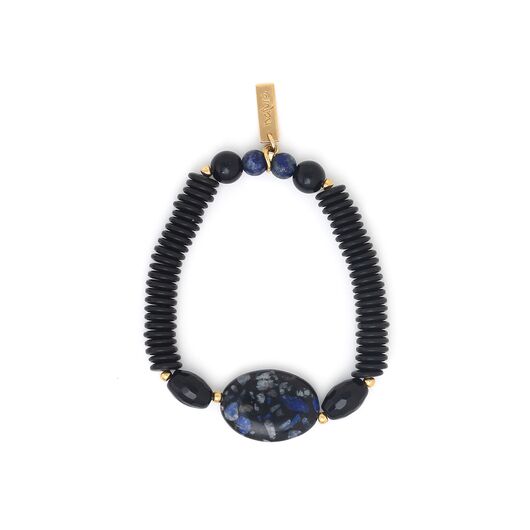 ფრანგული ბრენდი Nature Bijoux ს ხელნაკეთი სამაჯური, კოლექციიდან VENEZIA. სამკაულის ბაზად გამოყენებულია თითბერი, კოლექციაში გამოყენებული ნატურალური მასალები და ქვები: აგატი, ქოქოსის ხე, ლაზურიტი, ტყავი, ლაქებიანი იასპი.