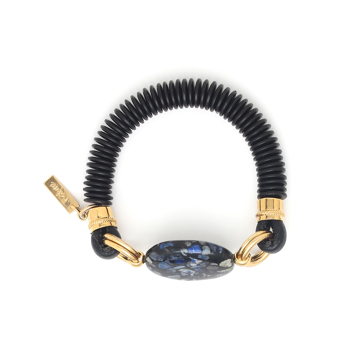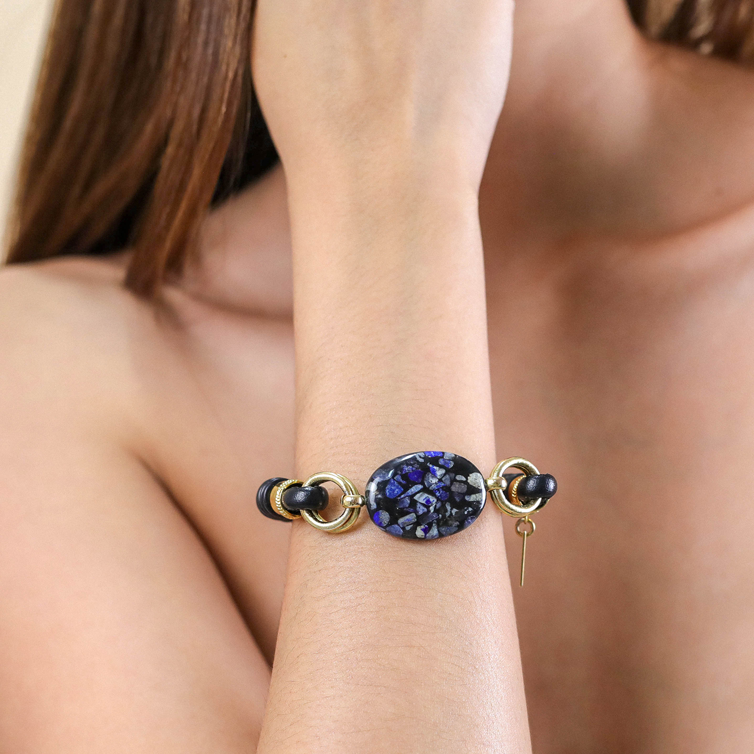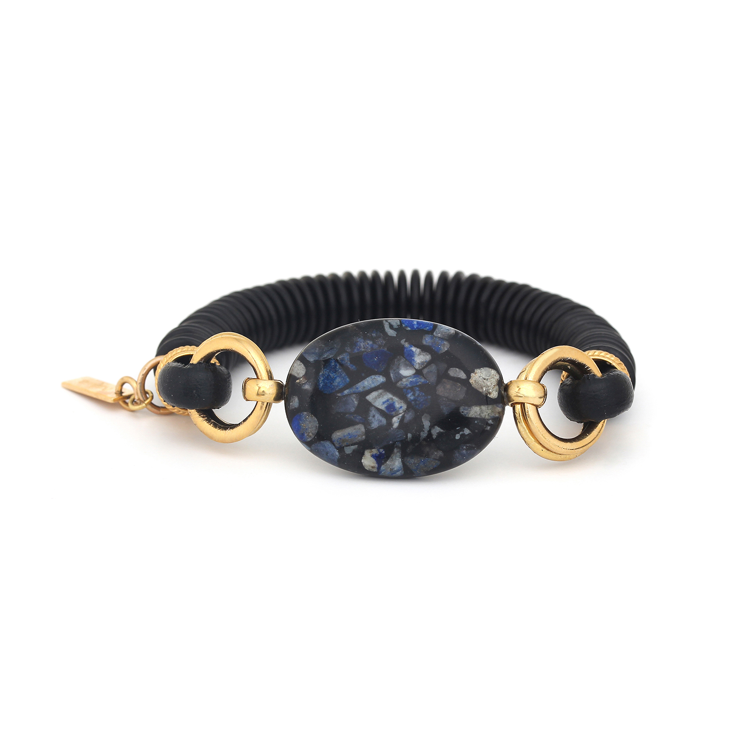 ფრანგული ბრენდი Nature Bijoux ს ხელნაკეთი სამაჯური, კოლექციიდან VENEZIA. სამკაულის ბაზად გამოყენებულია თითბერი, კოლექციაში გამოყენებული ნატურალური მასალები და ქვები: აგატი, ქოქოსის ხე, ლაზურიტი, ტყავი, ლაქებიანი იასპი.
