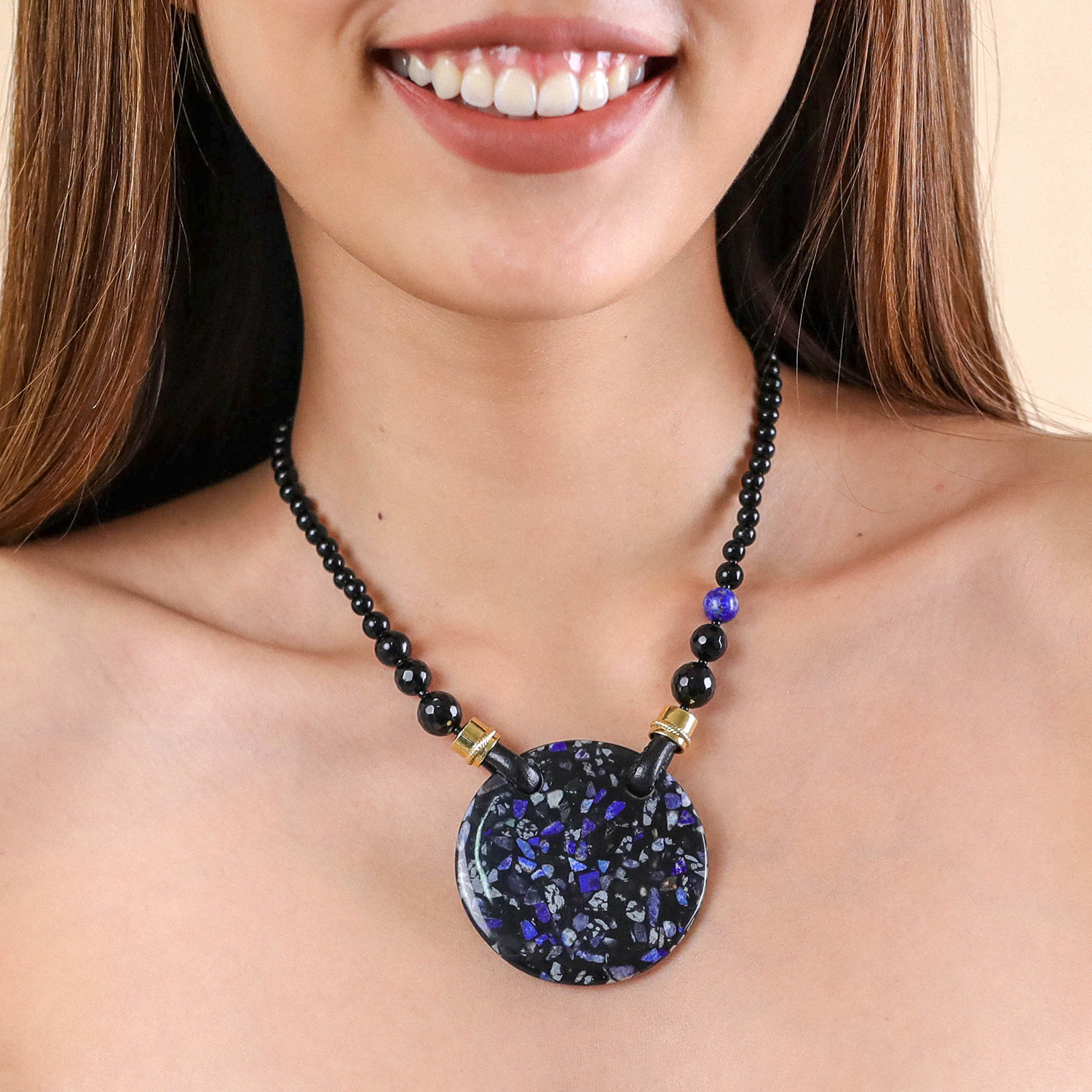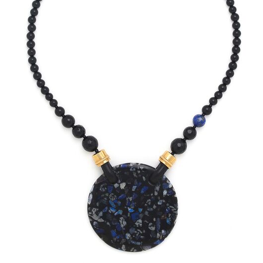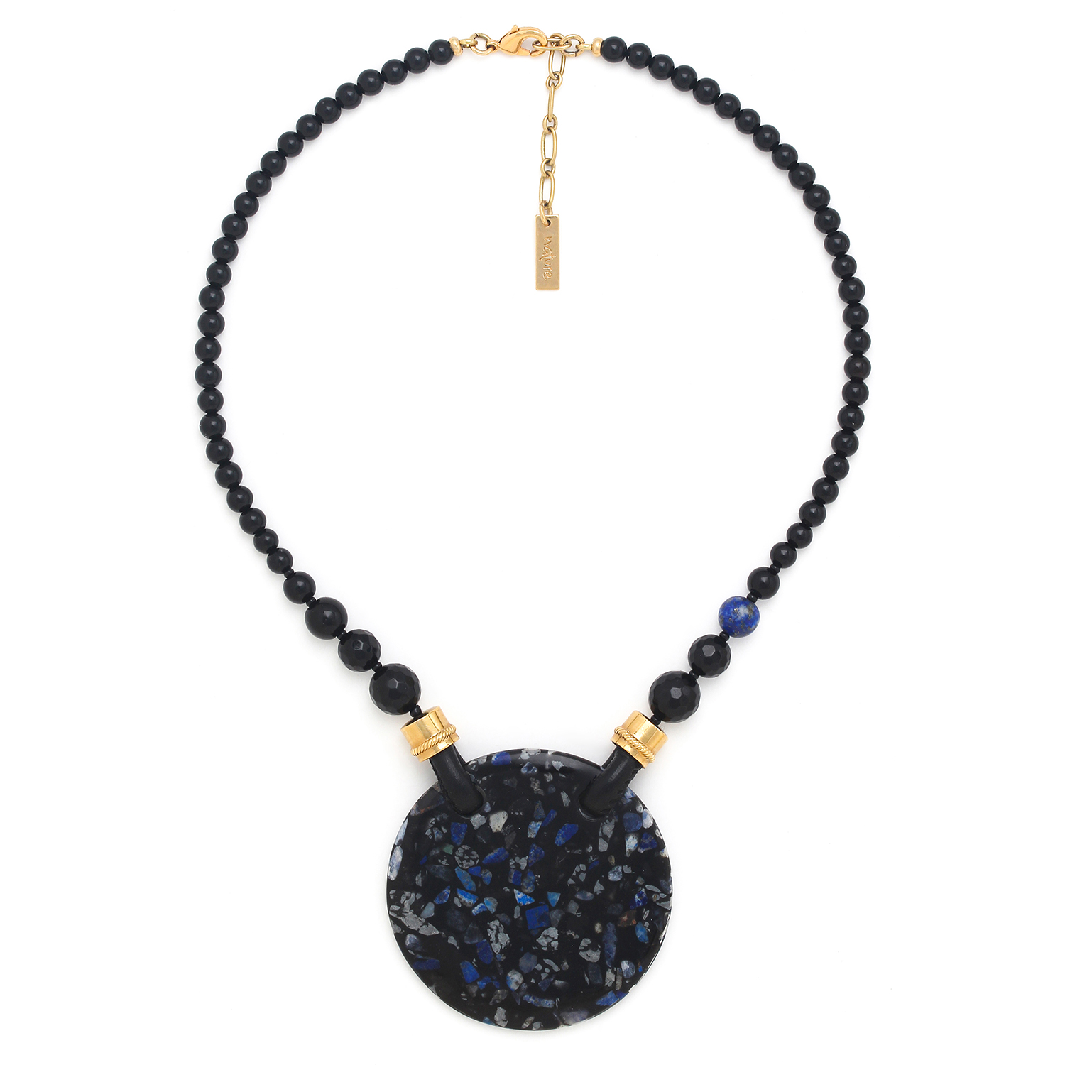 ფრანგული ბრენდი Nature Bijoux ს ხელნაკეთი ყელსაბამი, კოლექციიდან VENEZIA. სამკაულის ბაზად გამოყენებულია თითბერი, კოლექციაში გამოყენებული ნატურალური მასალები და ქვები: აგატი, ქოქოსის ხე, ლაზურიტი, ტყავი, ლაქებიანი იასპი.