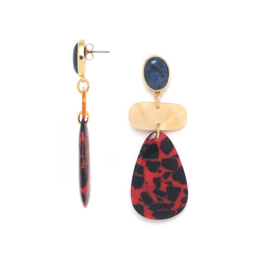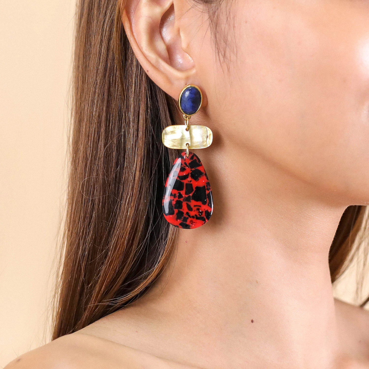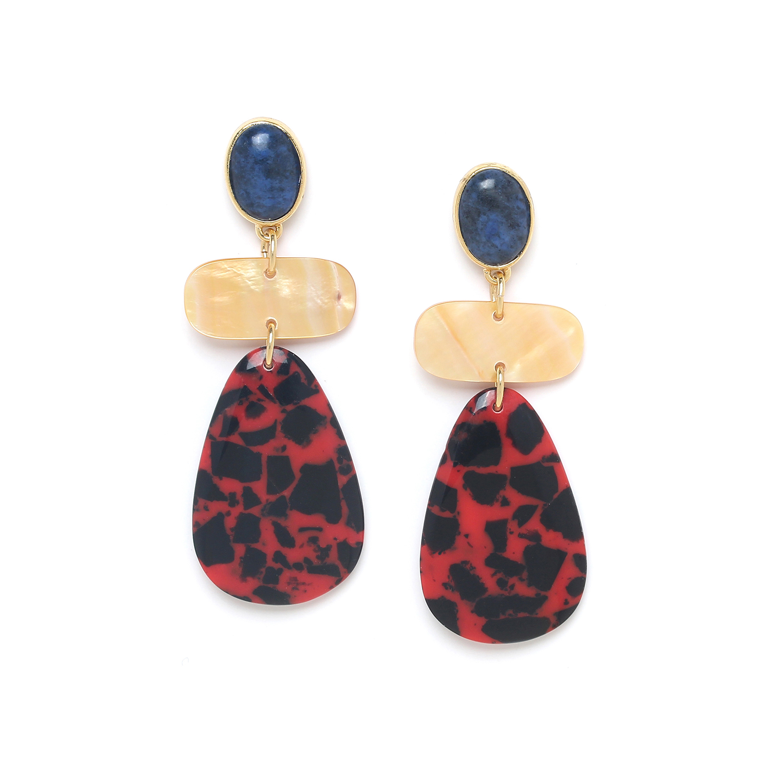 ფრანგული ბრენდი Nature Bijoux ს ხელნაკეთი საყურე, კოლექციიდან VESUVIO. სამკაულის ბაზად გამოყენებულია თითბერი, კოლექციაში გამოყენებული ნატურალური მასალები და ქვები: სადაფი, ტყავი, დუმორტერიტი,რქა, დამუშავებული ბამბის ძაფი, ფისში დამუშავებული ნახშირი.