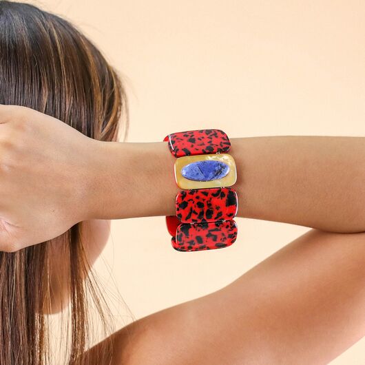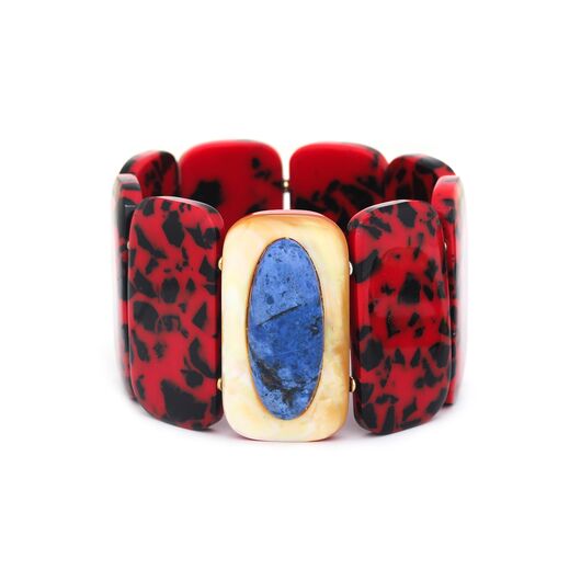 ფრანგული ბრენდი Nature Bijoux ს ხელნაკეთი სამაჯური, კოლექციიდან VESUVIO. სამკაულის ბაზად გამოყენებულია თითბერი, კოლექციაში გამოყენებული ნატურალური მასალები და ქვები: სადაფი, ტყავი, დუმორტერიტი,რქა, დამუშავებული ბამბის ძაფი, ფისში დამუშავებული ნახშირი.