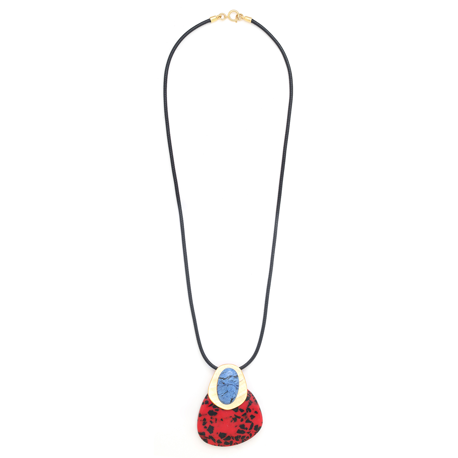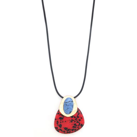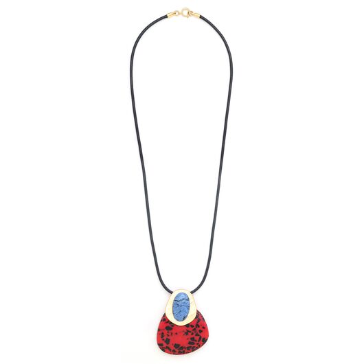 ფრანგული ბრენდი Nature Bijoux ს ხელნაკეთი ყელსაბამი, კოლექციიდან VESUVIO. სამკაულის ბაზად გამოყენებულია თითბერი, კოლექციაში გამოყენებული ნატურალური მასალები და ქვები: სადაფი, ტყავი, დუმორტერიტი,რქა, დამუშავებული ბამბის ძაფი, ფისში დამუშავებული ნახშირი.