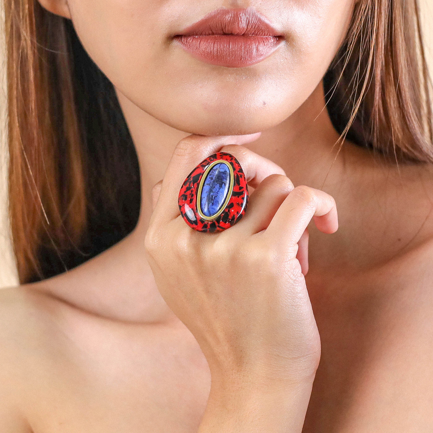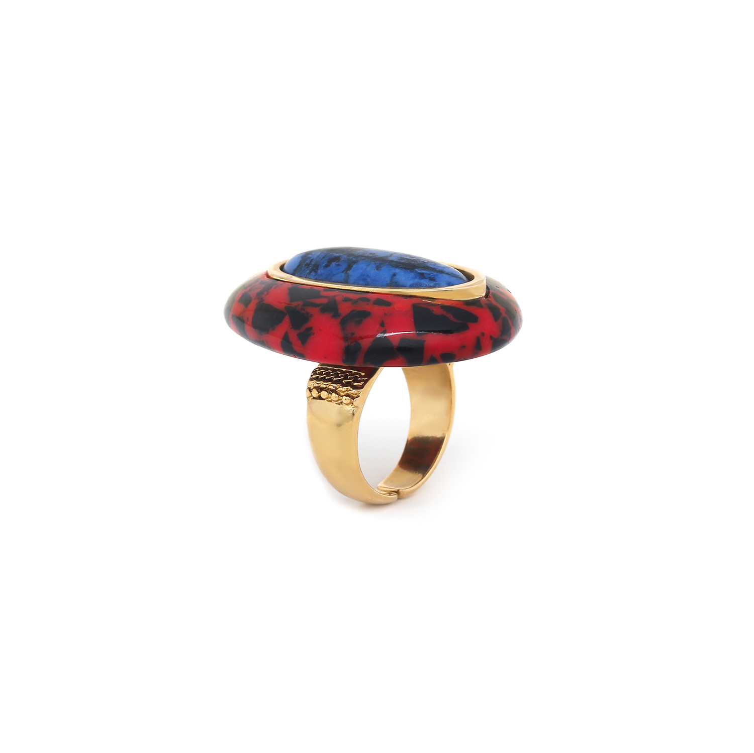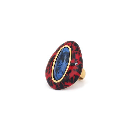 ფრანგული ბრენდი Nature Bijoux ს ხელნაკეთი ბეჭედი, კოლექციიდან VESUVIO. სამკაულის ბაზად გამოყენებულია თითბერი, კოლექციაში გამოყენებული ნატურალური მასალები და ქვები: სადაფი, ტყავი, დუმორტერიტი,რქა, დამუშავებული ბამბის ძაფი, ფისში დამუშავებული ნახშირი.