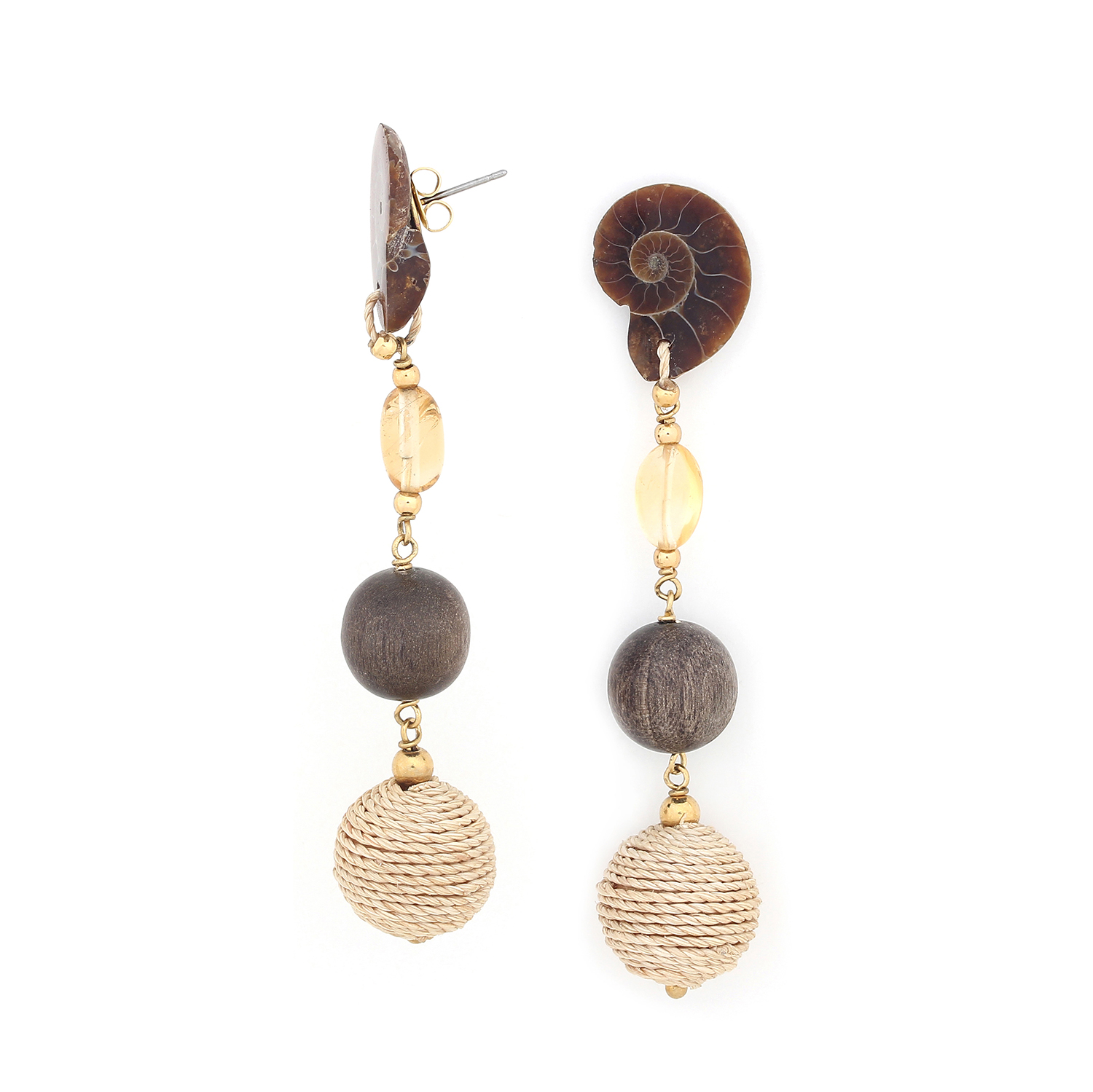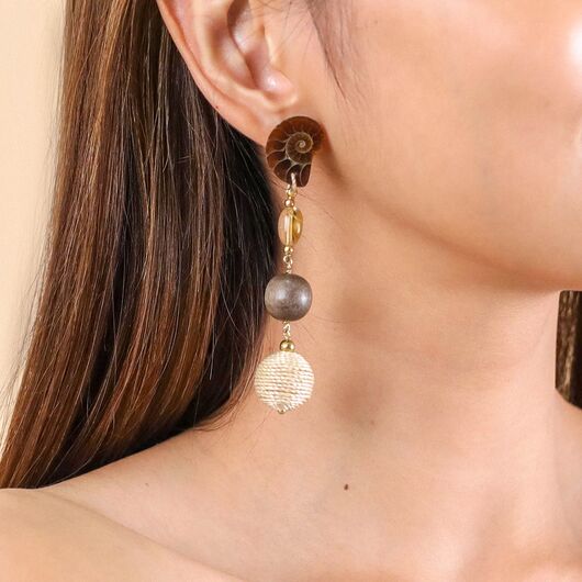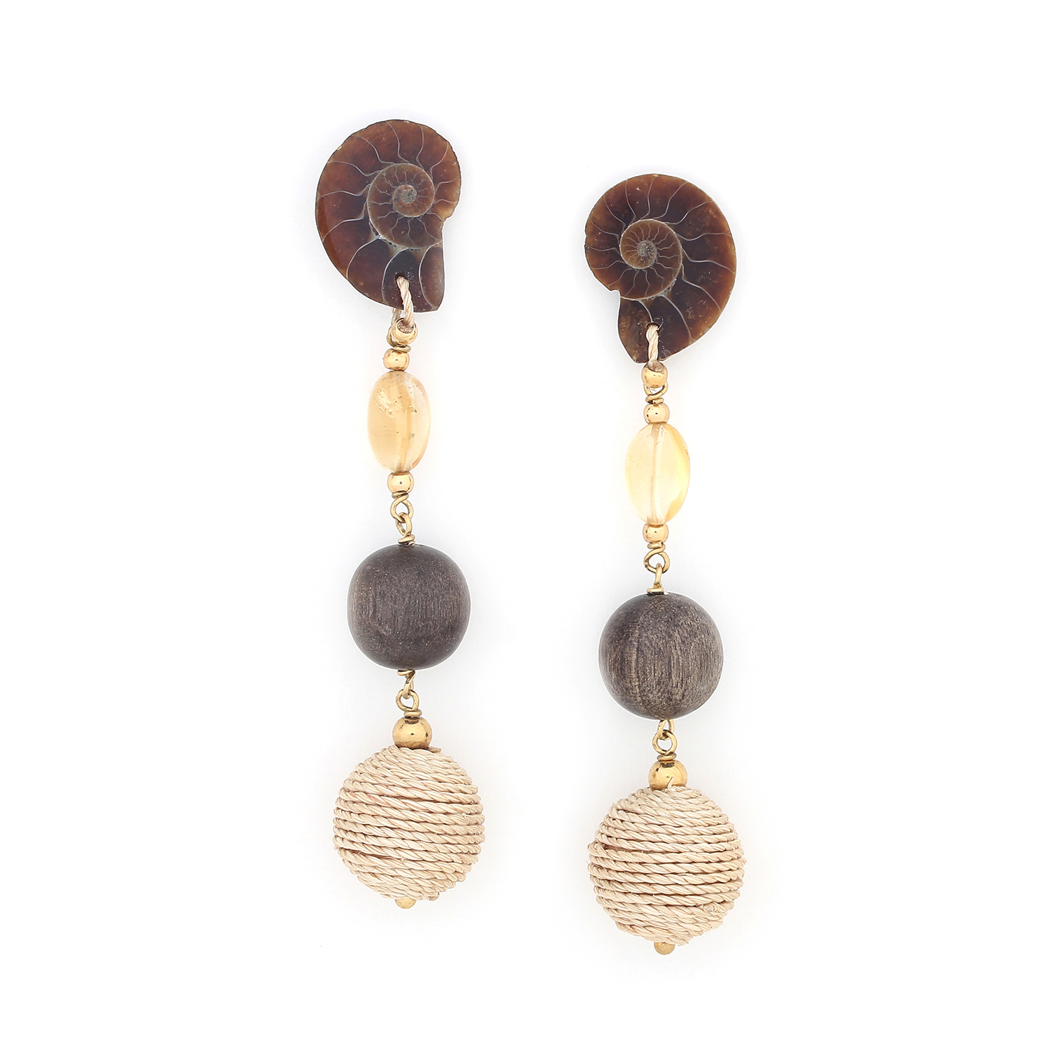 ფრანგული ბრენდი Nature Bijoux ს ხელნაკეთი საყურე, კოლექციიდან WABI. სამკაულის ბაზად გამოყენებულია თითბერი, კოლექციაში გამოყენებული ნატურალური მასალები და ქვები: ციტრინი, მცენარის ბოჭკო, ამონიტი, ბოდის თესლი, სადაფი, ნაცრისფერი აბანოზის ხე.