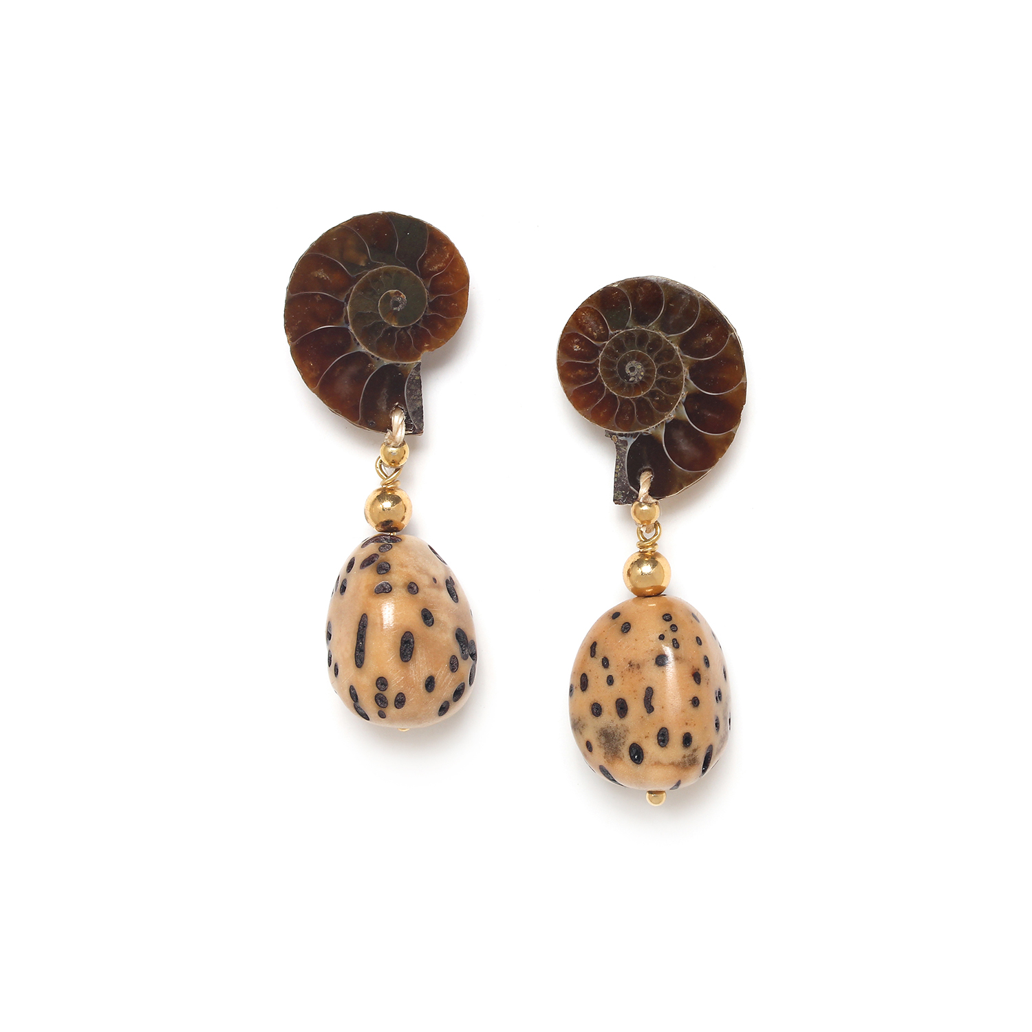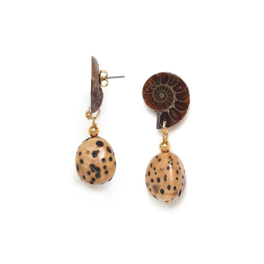 ფრანგული ბრენდი Nature Bijoux ს ხელნაკეთი საყურე, კოლექციიდან WABI. სამკაულის ბაზად გამოყენებულია თითბერი, კოლექციაში გამოყენებული ნატურალური მასალები და ქვები: ციტრინი, მცენარის ბოჭკო, ამონიტი, ბოდის თესლი, სადაფი, ნაცრისფერი აბანოზის ხე.