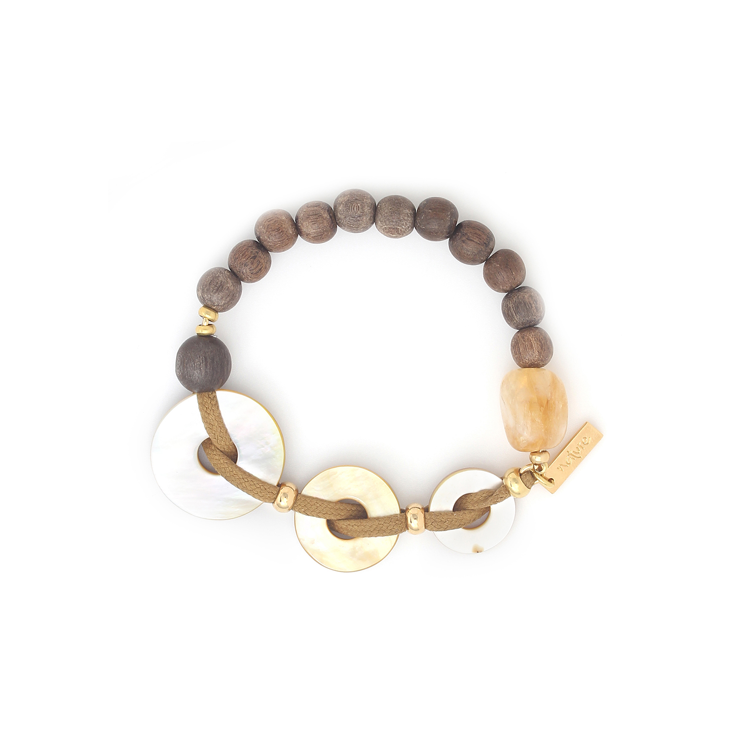 ფრანგული ბრენდი Nature Bijoux ს ხელნაკეთი სამაჯური, კოლექციიდან WABI. სამკაულის ბაზად გამოყენებულია თითბერი, კოლექციაში გამოყენებული ნატურალური მასალები და ქვები: ციტრინი, მცენარის ბოჭკო, ამონიტი, ბოდის თესლი, სადაფი, ნაცრისფერი აბანოზის ხე.