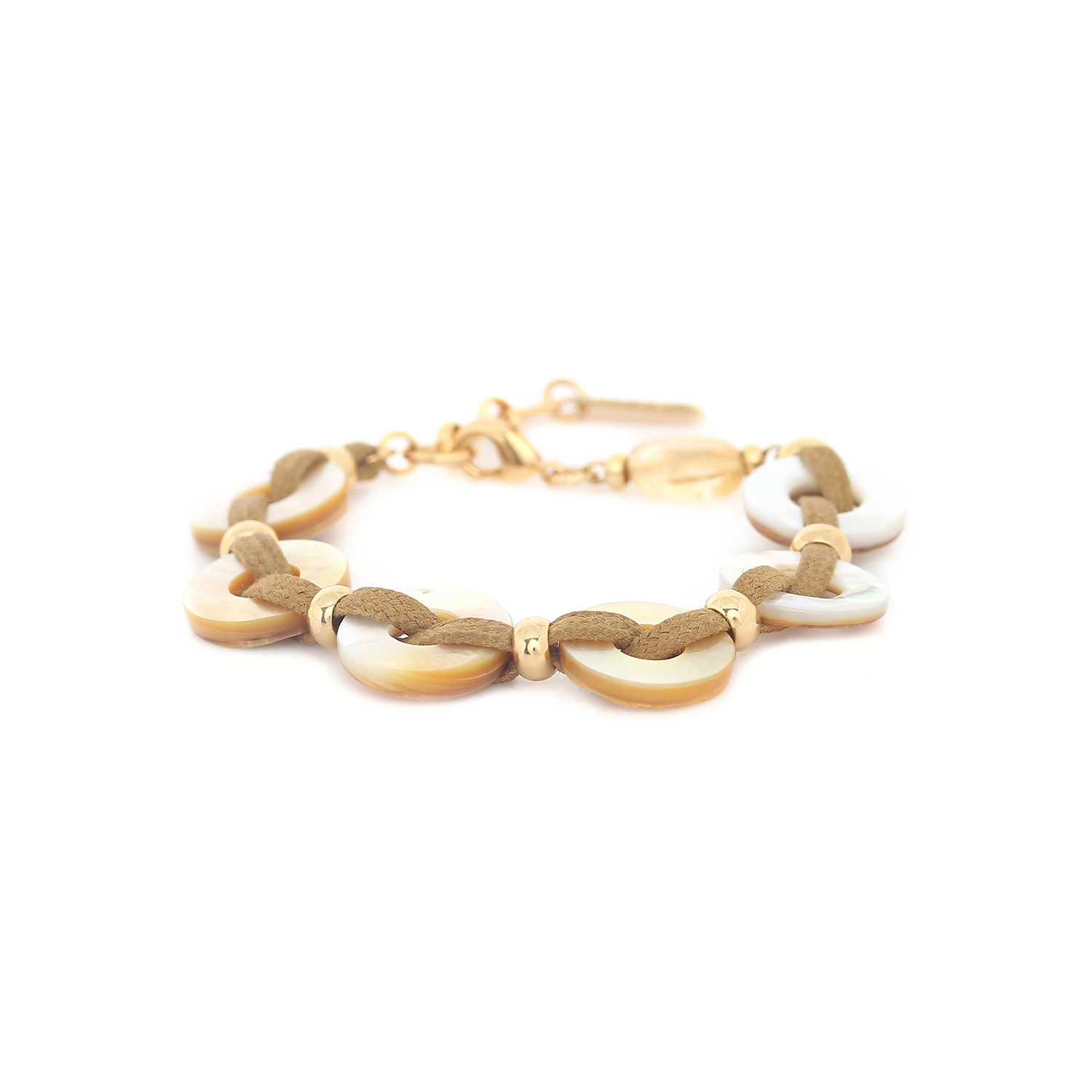 ფრანგული ბრენდი Nature Bijoux ს ხელნაკეთი სამაჯური, კოლექციიდან WABI. სამკაულის ბაზად გამოყენებულია თითბერი, კოლექციაში გამოყენებული ნატურალური მასალები და ქვები: ციტრინი, მცენარის ბოჭკო, ამონიტი, ბოდის თესლი, სადაფი, ნაცრისფერი აბანოზის ხე.
