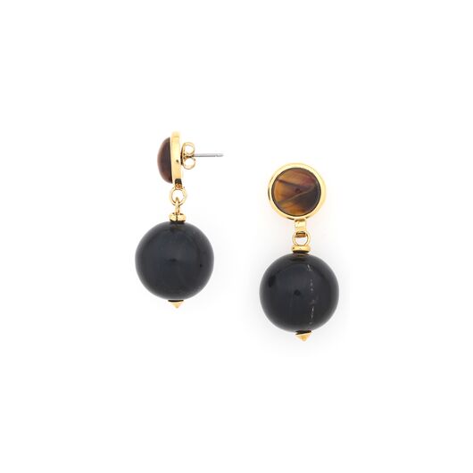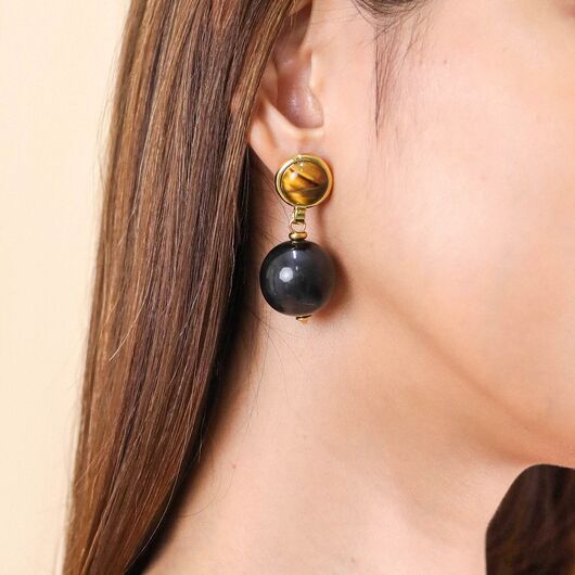 ფრანგული ბრენდი Nature Bijoux ს ხელნაკეთი საყურე, კოლექციიდან ZEBRA. სამკაულის ბაზად გამოყენებულია თითბერი, კოლექციაში გამოყენებული ნატურალური მასალები და ქვები: რქა, ფისში დამუშავებული ქვიშა, სადაფი, ვეფხვის თვალი.