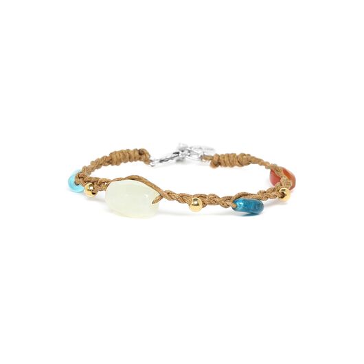 ფრანგული ბრენდი Nature Bijoux ს ხელნაკეთი სამაჯური, კოლექციიდან PETIT POUCET. სამკაულის ბაზად გამოყენებულია თითბერი, კოლექციაში გამოყენებული ნატურალური მასალები და ქვები: ცისფერი ქალცედონი, სპილენძი, ბამბის ძაფი, დალმატური იასპი, ლაბრადორიტი, ყვითელი იასპი.