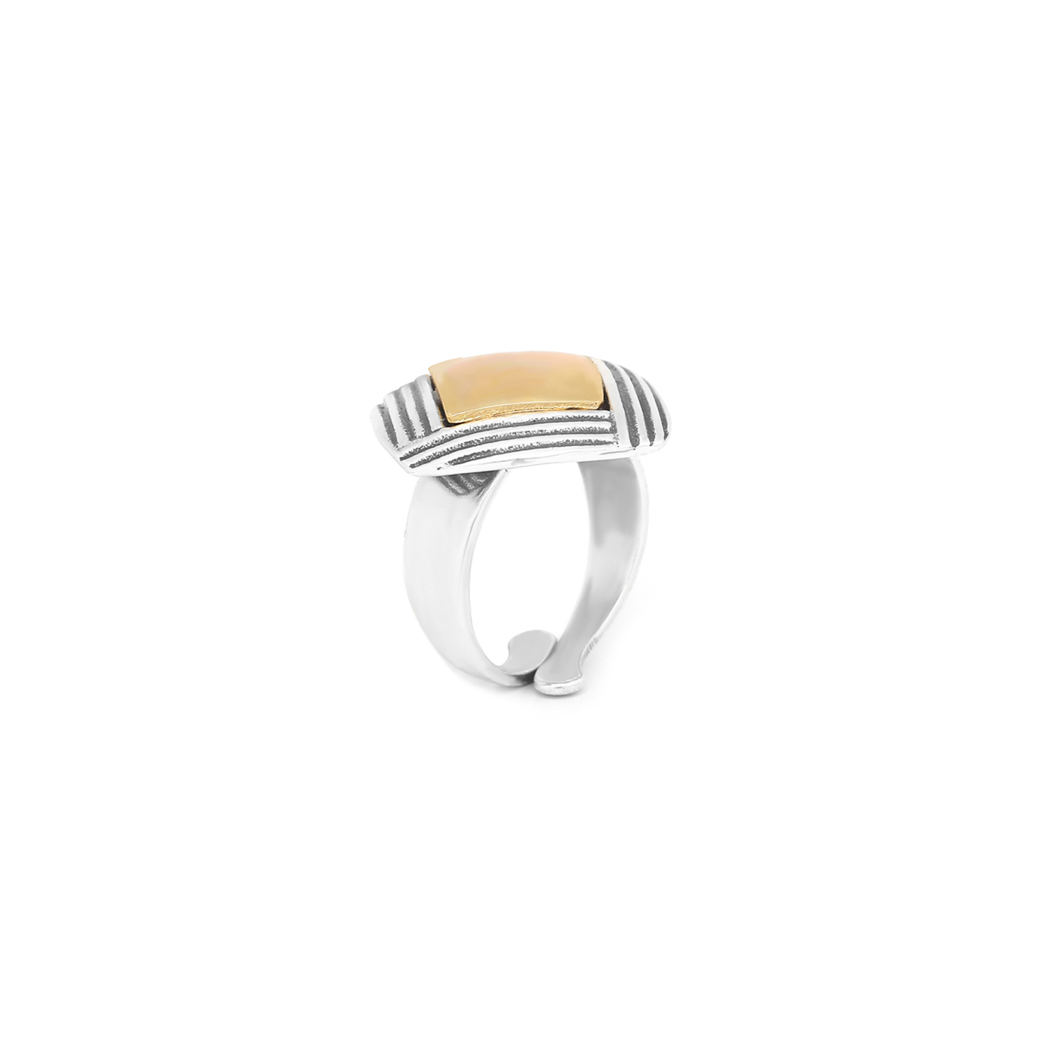 ფრანგული ბრენდი Ori Taos ს ხელნაკეთი ბეჭედი, კოლექციიდან DANDY. სამკაულის ბაზად გამოყენებულია თითბერი, კოლექციაში გამოყენებული ნატურალური მასალები და ქვები: