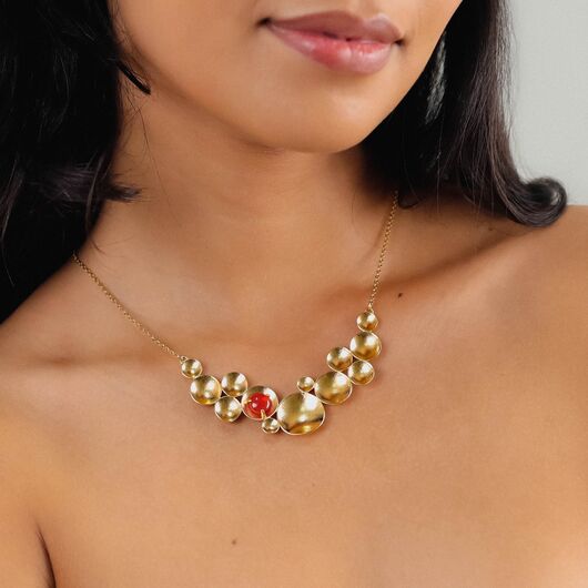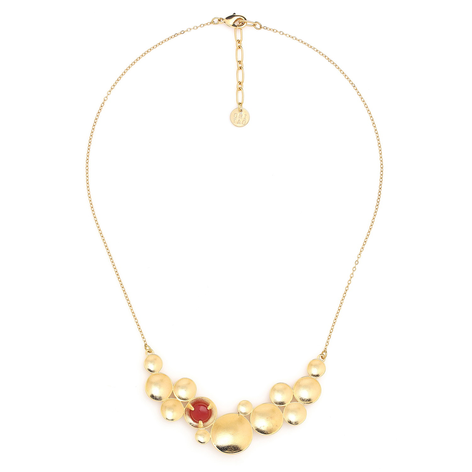 ფრანგული ბრენდი Ori Taos ს ხელნაკეთი ყელსაბამი, კოლექციიდან JIMILI. სამკაულის ბაზად გამოყენებულია თითბერი, კოლექციაში გამოყენებული ნატურალური მასალები და ქვები: აქატი, ლაპის ლაზული, თითბერი