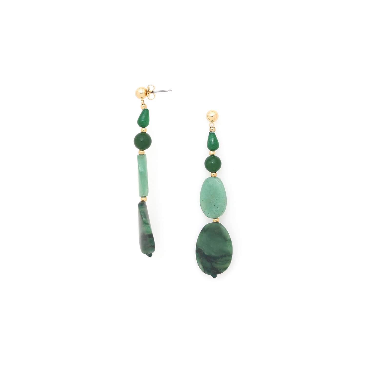 ფრანგული ბრენდი Nature Bijoux ს ხელნაკეთი საყურე, კოლექციიდან AGATA VERDE. სამკაულის ბაზად გამოყენებულია თითბერი, კოლექციაში გამოყენებული ნატურალური მასალები და ქვები: აგატი, ნეფრიტი, ავანტურინი.