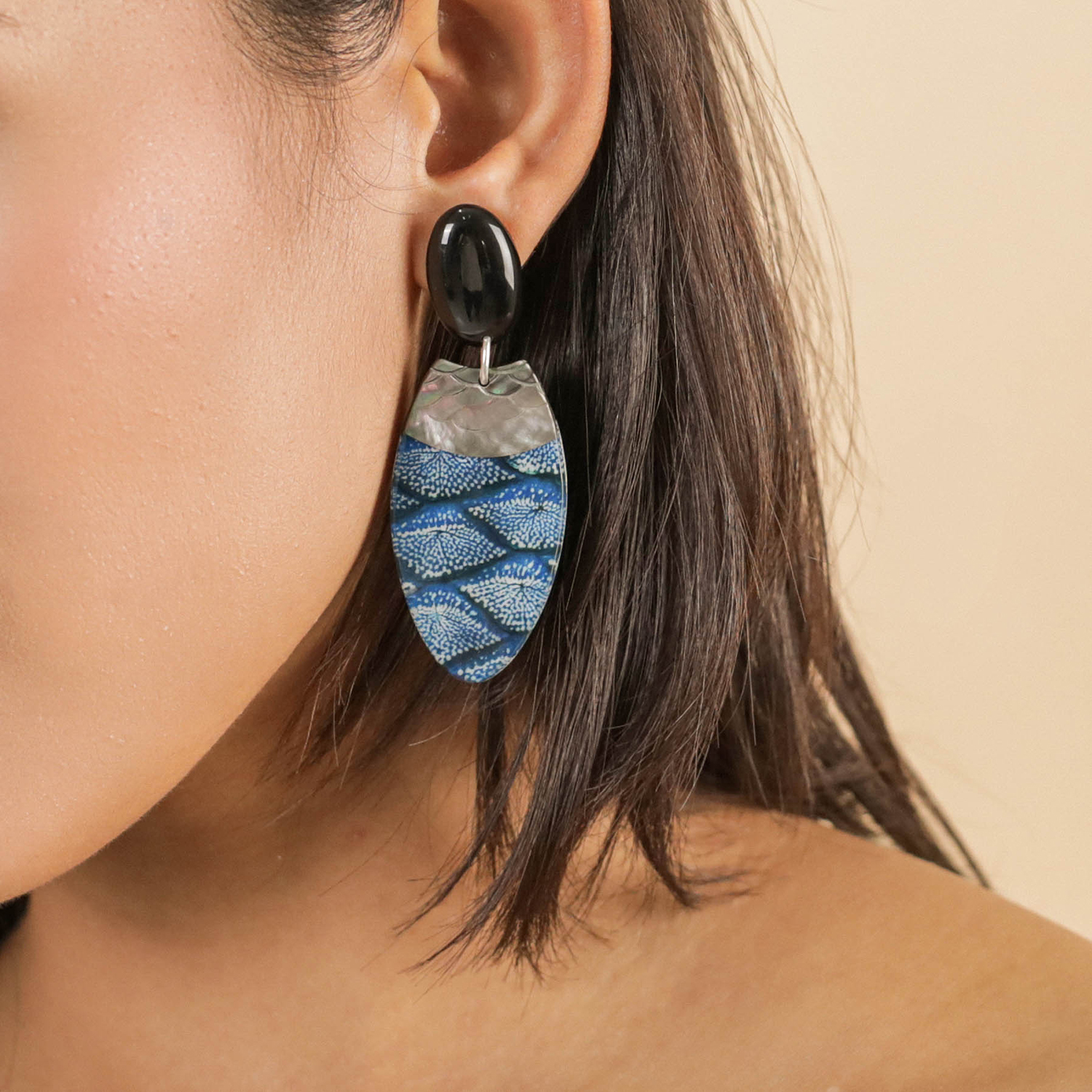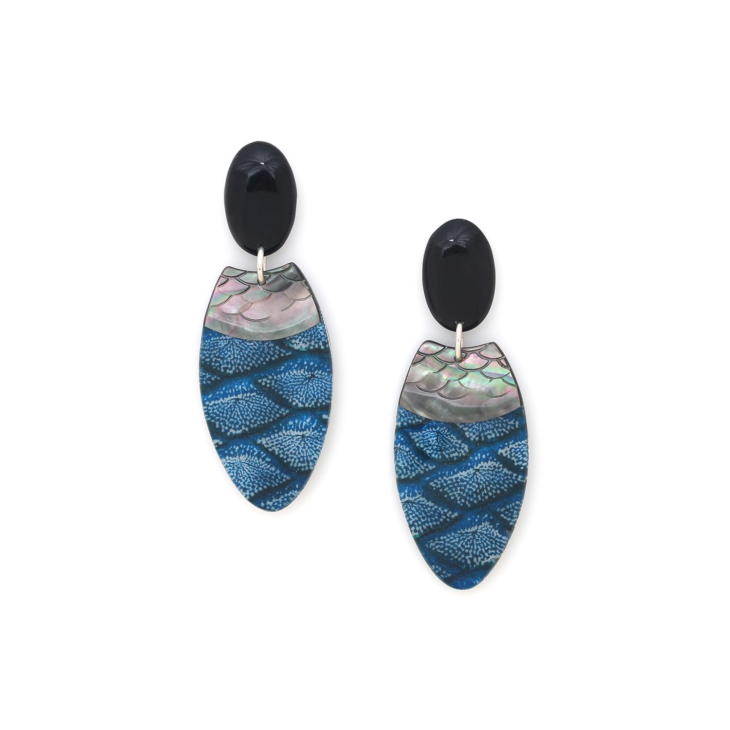 ფრანგული ბრენდი Nature Bijoux ს ხელნაკეთი საყურე, კოლექციიდან CORFOU. სამკაულის ბაზად გამოყენებულია თითბერი, კოლექციაში გამოყენებული ნატურალური მასალები და ქვები: ფალავანის დედა მარგალიტი,ბამბის ძაფი, რქა, თევზის ტყავი, თითბერი.