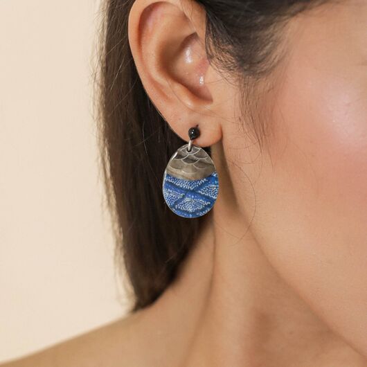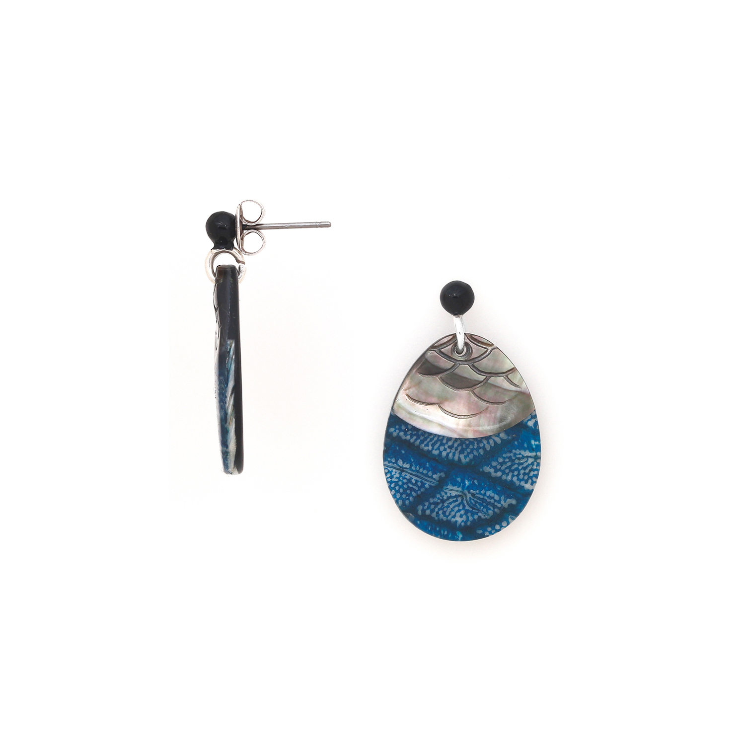 ფრანგული ბრენდი Nature Bijoux ს ხელნაკეთი საყურე, კოლექციიდან CORFOU. სამკაულის ბაზად გამოყენებულია თითბერი, კოლექციაში გამოყენებული ნატურალური მასალები და ქვები: ფალავანის დედა მარგალიტი,ბამბის ძაფი, რქა, თევზის ტყავი, თითბერი.